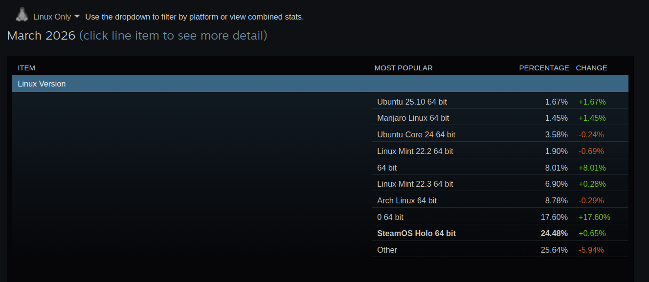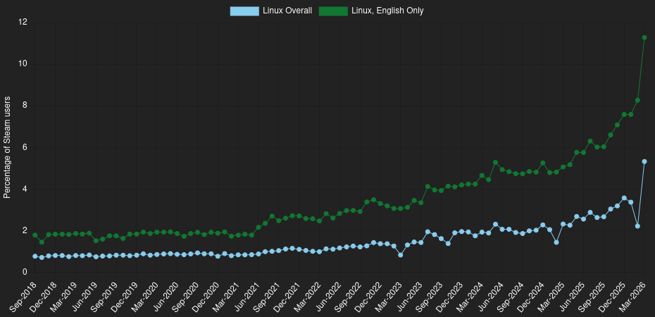 It's probably some kind of bug. Valve has corrected the data before. For example, the December data was obviously broken and then it was fixed a few days later.Linux has been trending upwards for years and so last month probably would have shown an increase anyway (as would February if not for China), but this is too huge to be real unless there's some good reason that March 2026 in particular should have been the start of an unprecedented migration to Linux.