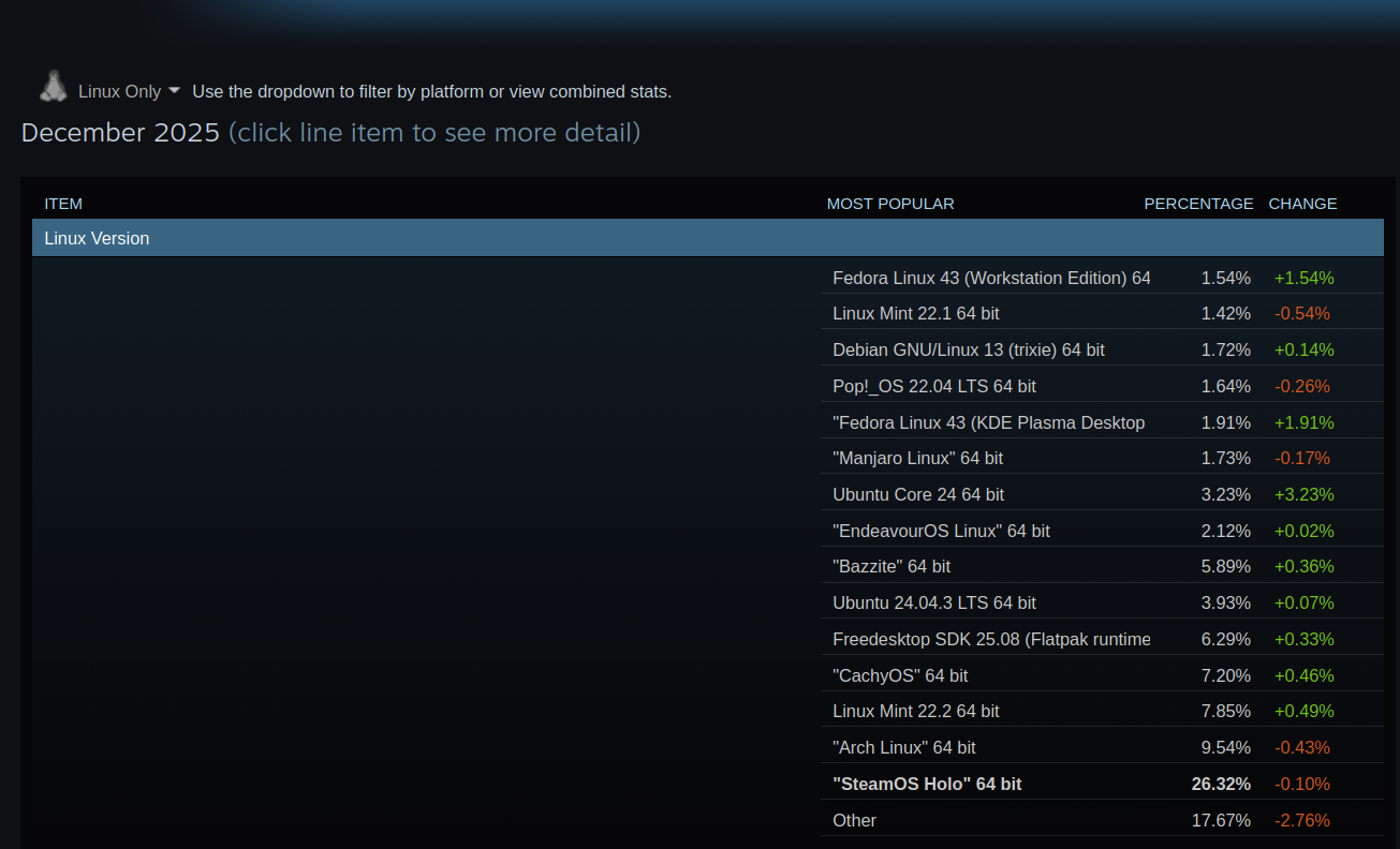 >>736369670no, cutting those numbers away is just retardedthe survey is obviously misclassifying all the big rolling distros like cachyos, bazzite and fedorait's because steam is moving to wayland