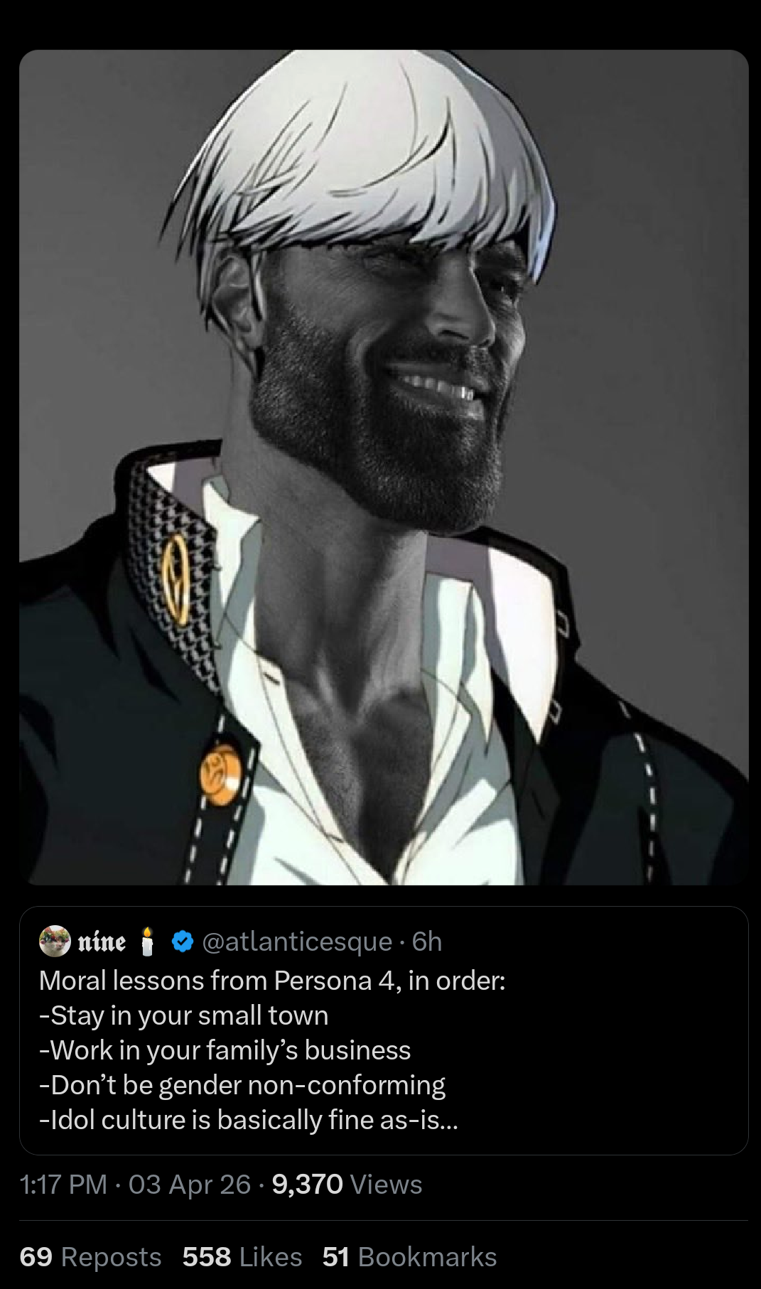 I mean whatever as long as troons don't forget Persona 4 is a chud game for chad chuds