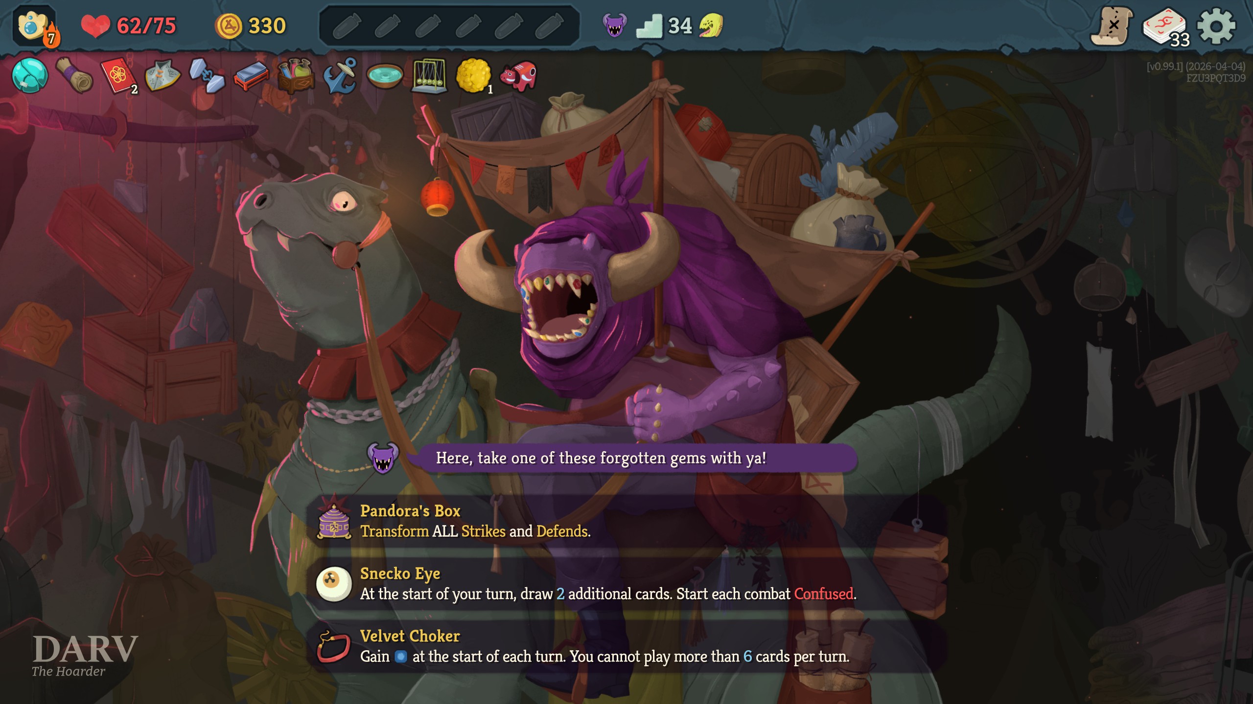 >>736382021Then yes, I can agree in your very narrow scenario of 2 cards to Pandora and zero cost spam, Darv gave you a bad roll.But those relics would be a dream for most runs.