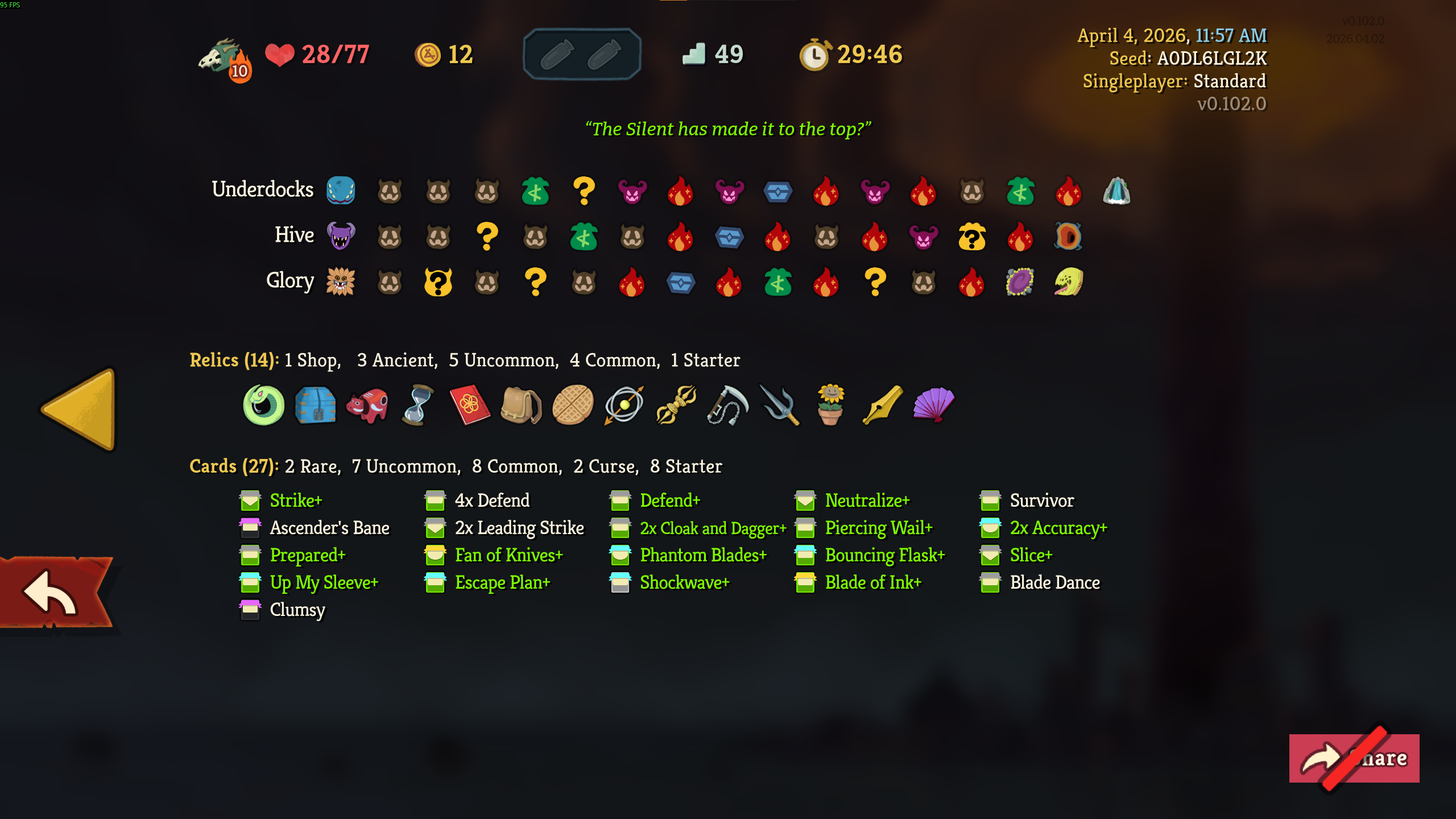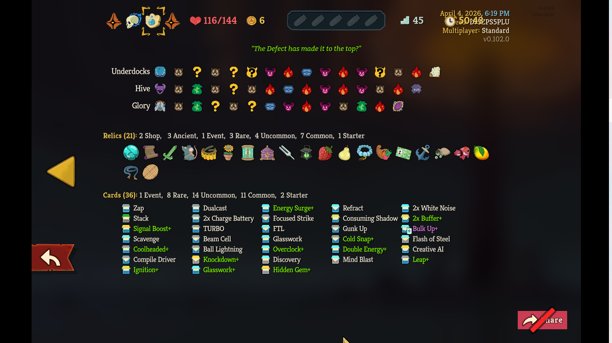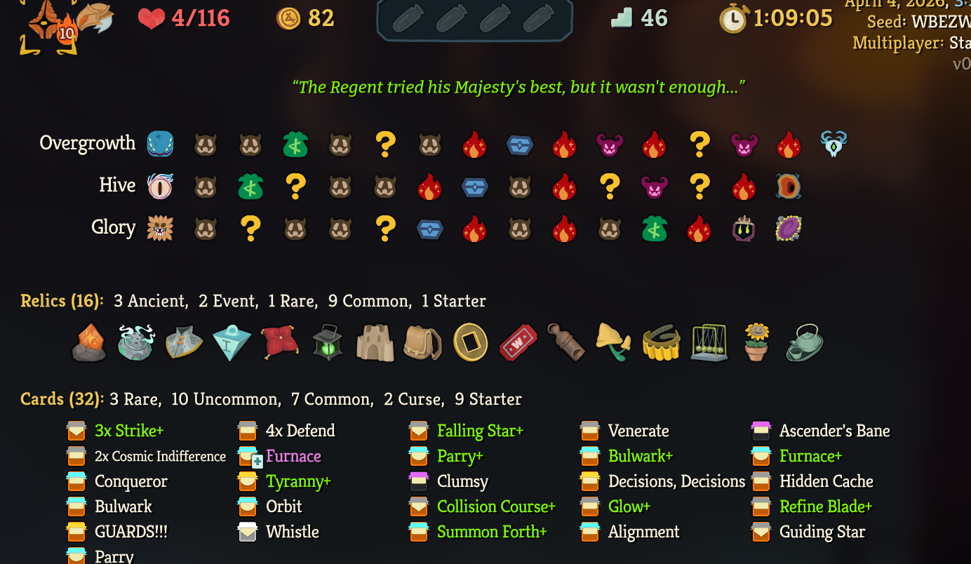 Been replaying slay the spire 1 for comparison and I think the biggest upgrade the sequel has over the original is the introduction of ancients and how their relics are incredibly more varied than the original boss relics and the removal of cards that were too OP or too Jank (Wraith Form, Searing Blow, Hello World, Dual Wield (yes I know some of these are still in the game but they aren't in the standard pool anymore))And the think what I dislike the most is that there's no act 4 boss, this game has been in development for over 5 years, was it so fucking hard to at least repeat the heart as a placeholder?