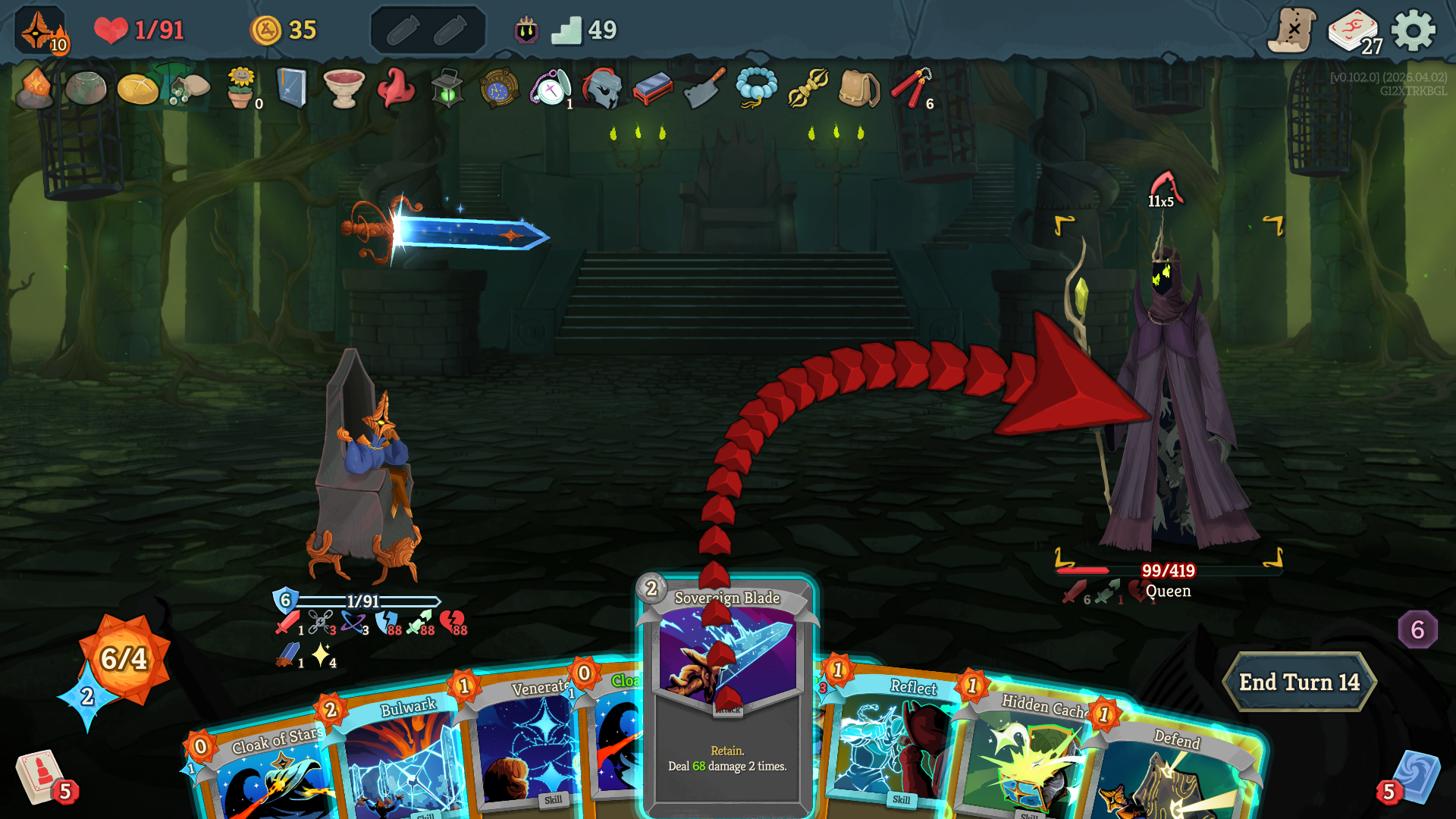 >>736393131After playing like 10 hours with him, he feels like a very late game kind of character. Sovereignty Blade build and Star build are the only builds ive had moderate success with but thats only when I get really lucky with getting certain cards. Void Form and Big Bang imo are easily his best cards. But he seems to have a lot of cards that I frankly dont know what to do with or are just seem really niche. On top of having to juggle two resources, I often find myself kind of just playing solitaire more often then not usually dealing little damage and trying to get as much armor as I can. Even when you play all the cards you need and build up your Sovereign Blade or stars, itll often feel too late or not enough.