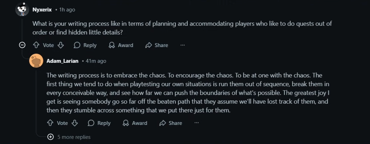 >>736385529they have spoken VERY highly about their new systems, with swen even going so far as to call it an "evolved turn based combat system" that is "intuitive but deep" and "let's you do amazing things"of course swen has a history of overpromising. but still, they sound very confident this time. they said the next thing they'll show us is gameplay, which I assume will be at PAX West, which is where they showed off BG3 gameplay.also they might be bringing back the DOS2 alpha idea of vaguely open world maps? we'll see.