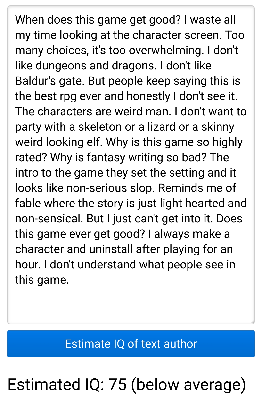 >>736382875The average gamer is average IQ but the average gamer plays Roblox and CoD, not DOS2