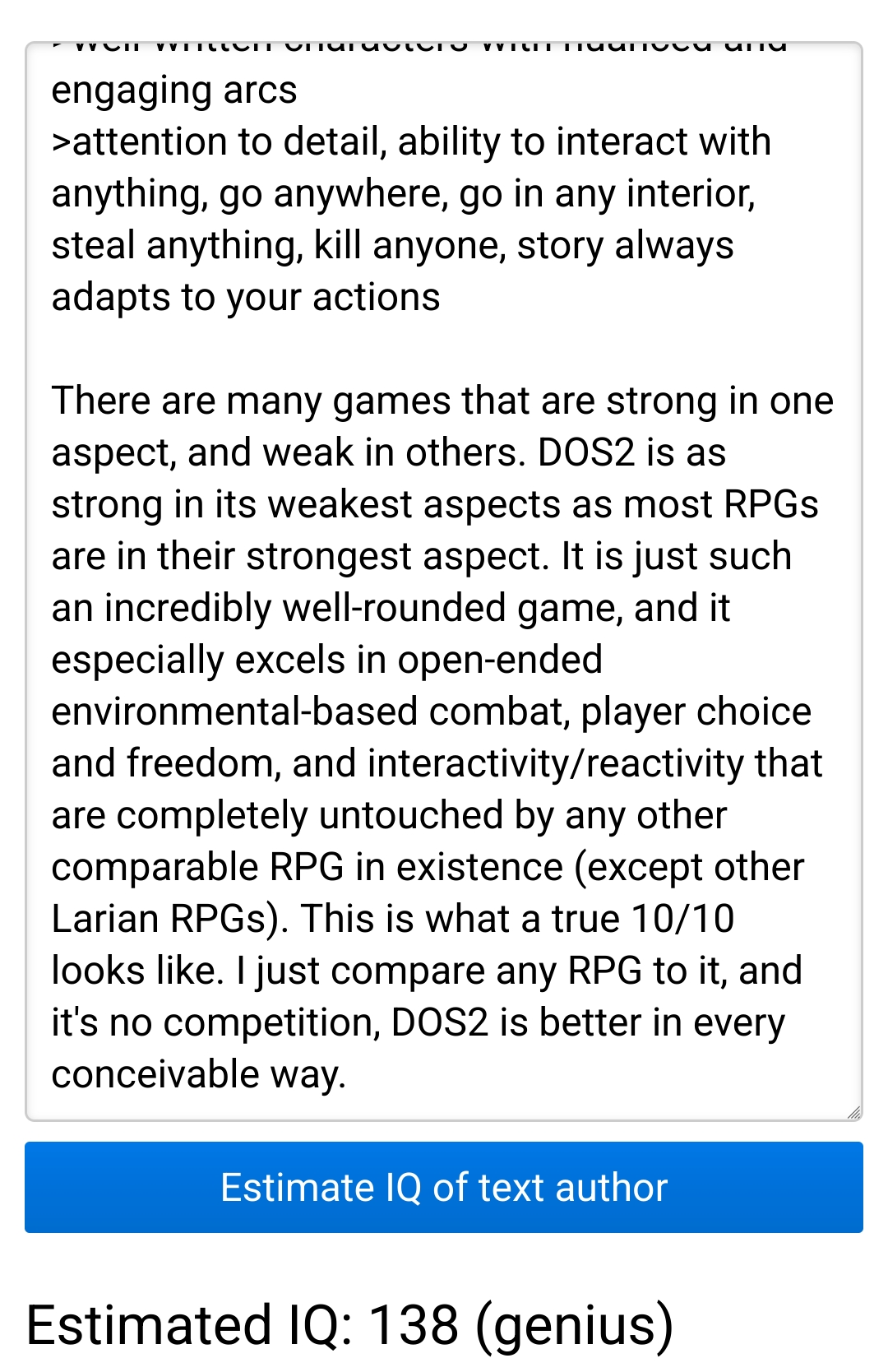 >>736379886It's a masterpiece.I beat it 4 years ago (4 playthroughs, Classic, Tactician, Honour, Honour noLW), and I just can't get over how far and above better it is than every RPG in existence.It has absolutely top-notch>sense of adventure, immersion, world-building>free-form, challenging, open-ended combat with strong focus on environmental interaction>deep mechanics, strong strategic elements, high replayability>tons of classes, build variety, spells, playstyles to tinker with>memorable fights against a huge variety of well-designed enemies & bosses in unique scenarios that take part in context of a greater narrative/quest, instead of just braindead throwaway trashmobs>limited, unique combat encounters and exponential level system remove the trash mob farming of most RPGs and ensure proper balance throughout the game>incredible intricate, inter-connected world design packed with secrets>memorable, open-ended and branching quests with tons of interactivity/reactivity>vast amounts of player choice & freedom>satisfying power fantasy story where you are a divine being honing his power and gathering strength>lighthearted, downright funny writing that still knows when to be serious or somber>well-written characters with nuanced and engaging arcs>attention to detail, ability to interact with anything, go anywhere, go in any interior, steal anything, kill anyone, story always adapts to your actionsThere are many games that are strong in one aspect, and weak in others. DOS2 is as strong in its weakest aspects as most RPGs are in their strongest aspect. It is just such an incredibly well-rounded game, and it especially excels in open-ended environmental-based combat, player choice and freedom, and interactivity/reactivity that are completely untouched by any other comparable RPG in existence (except other Larian RPGs). This is what a true 10/10 looks like. I just compare any RPG to it, and it's no competition, DOS2 is better in every conceivable way.