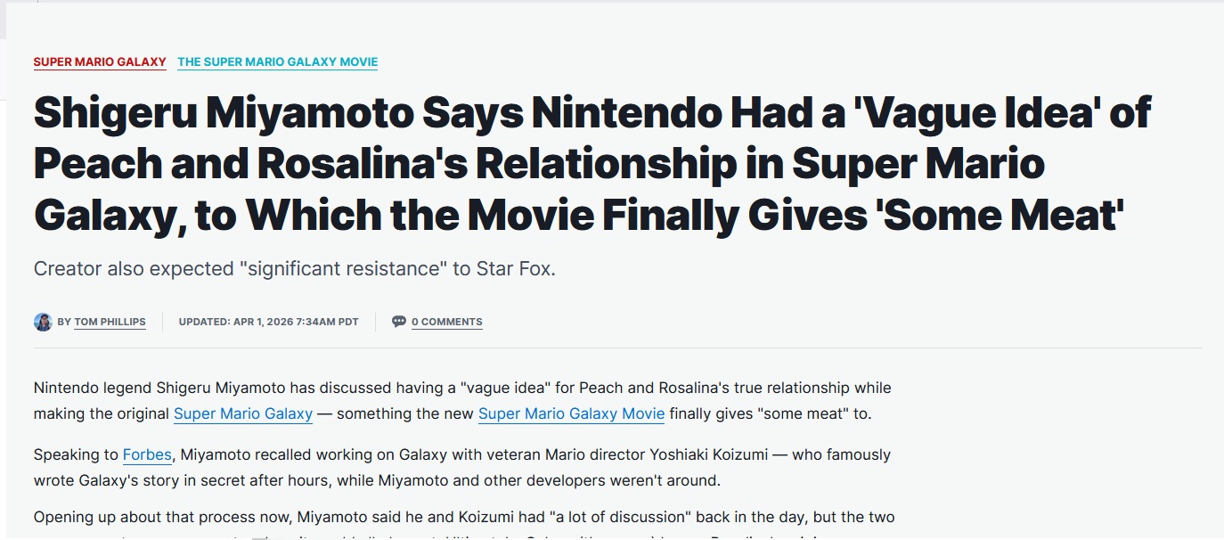 >>736411214>It's almost like they never played Mario Galaxy, or anything beyond Super Mario Bros. or Mario Kart.Well if interviews are anything to go by, this was probably due to Miyamoto and Nintendo meddling.Like feel free to hate the directors of the film, but if you take the interviews that Miyamoto gave at face value, then the reality is that this film couldnt be an actual adaptation cause Miyamoto of all times had to open his fucking mouth and say "This is Rosalina's(and Peach I gues) backstory now"Whatever original ideas and concepts Galaxy was touching basically CANT be touched cause Miyamoto wanted something explicitly different. And I dont care how much the directors suck, if Shiggy says Rosalina and Peach are sisters now, thats the end of it and they work with what theyre given