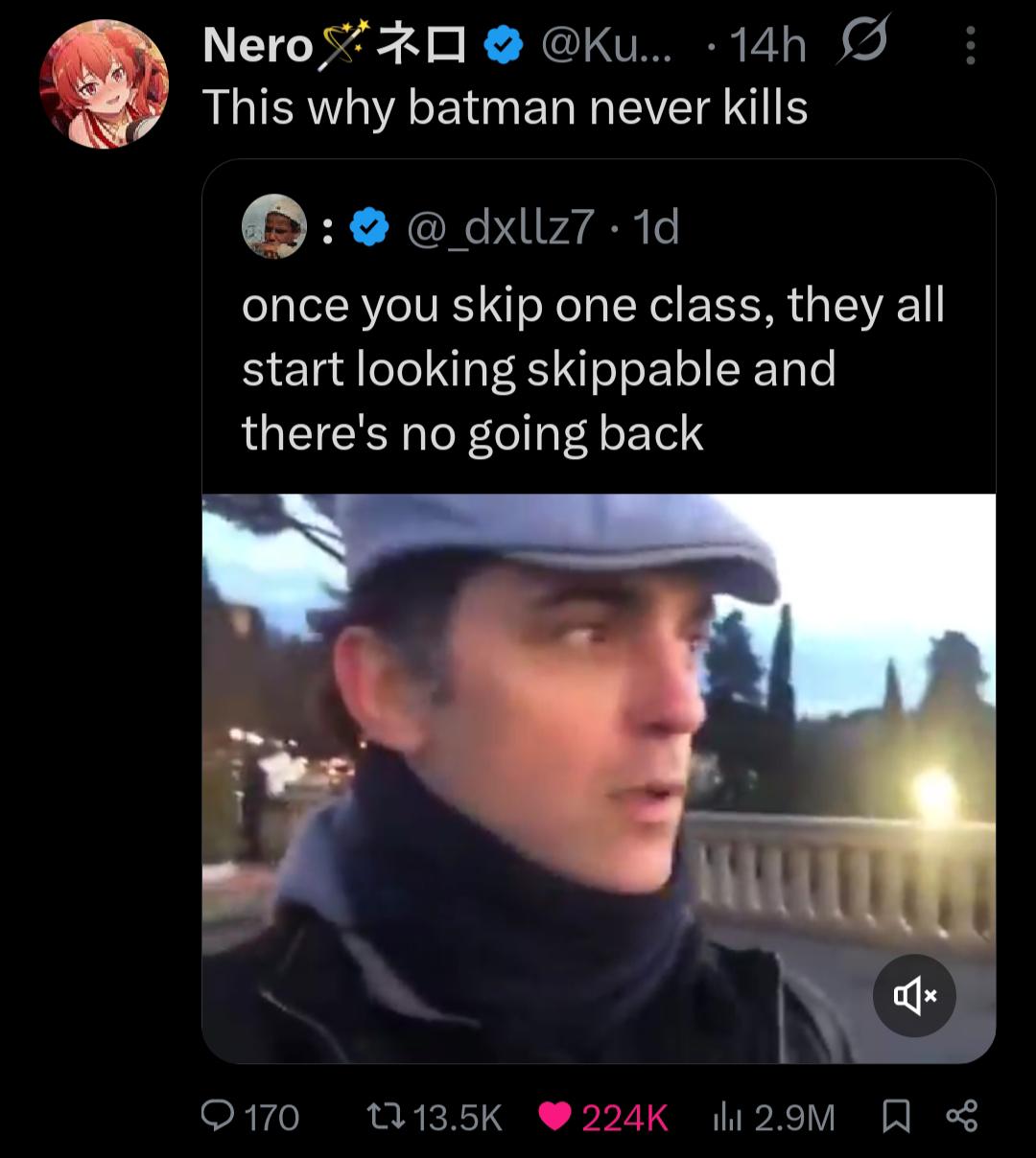 >>736402759>Batman drives the top of a thug's head into a brick wall>He gets knocked out and is left there with 0 medical assistance because there are no doctors>Dies shortly after from brain hemorrhaging