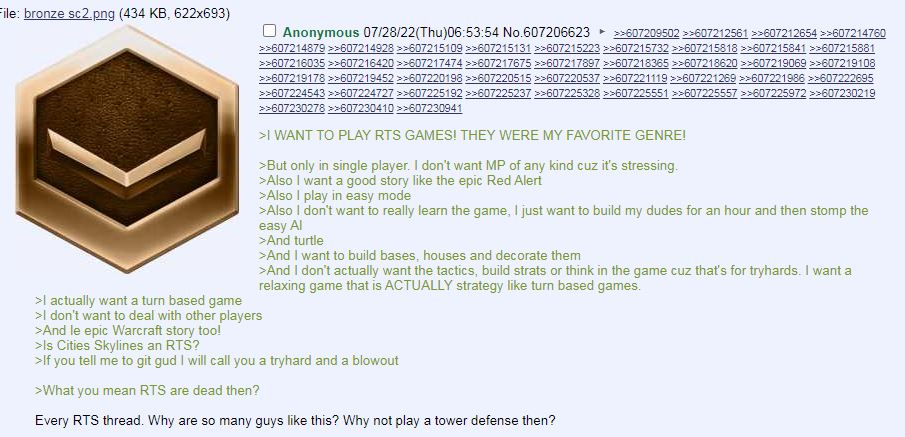 RTS games are not fun. I play video games to have fun, I don't care for this unfun sweatfag nonsense any more."y-you're bad" is the usual RTSfag cope respnose, and maybe, but I'm having fun