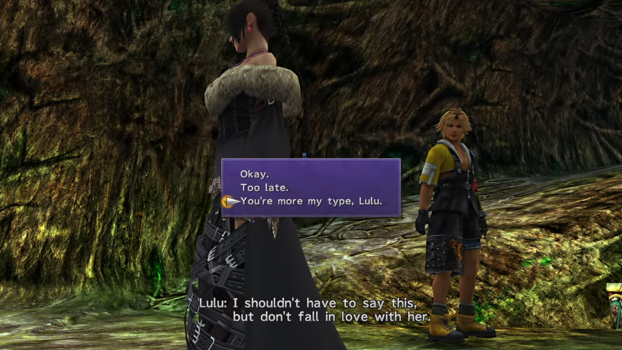 >>736398593Final Fantasy XIt kind of has romance system between Yuna, Lulu and Rikku (even though it eventually gets ignored because the story forces Yuna on you), and Lulu eventually ends up with Wakka.