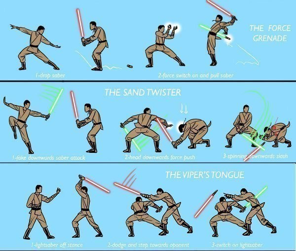 This is like the star wars version of those fake self defense guys that show off shit that would obviously get you killed, against untrained women or their friends instructed to play along with the scenario