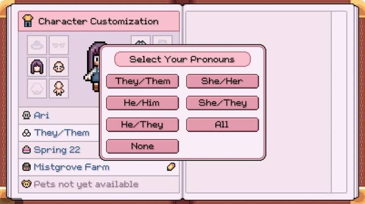 >>736420869I honestly love this game. Very cute and lighthearted setting, good sense of humor, love the character designs. They add a lot with each patch, and I'm looking forward to full release. I tried both this and unmodded SDV and I liked this way more./v/ only ever brings it up because of the stupid muh prononouns screen though which is too bad. I really think this game has a lot of heart.