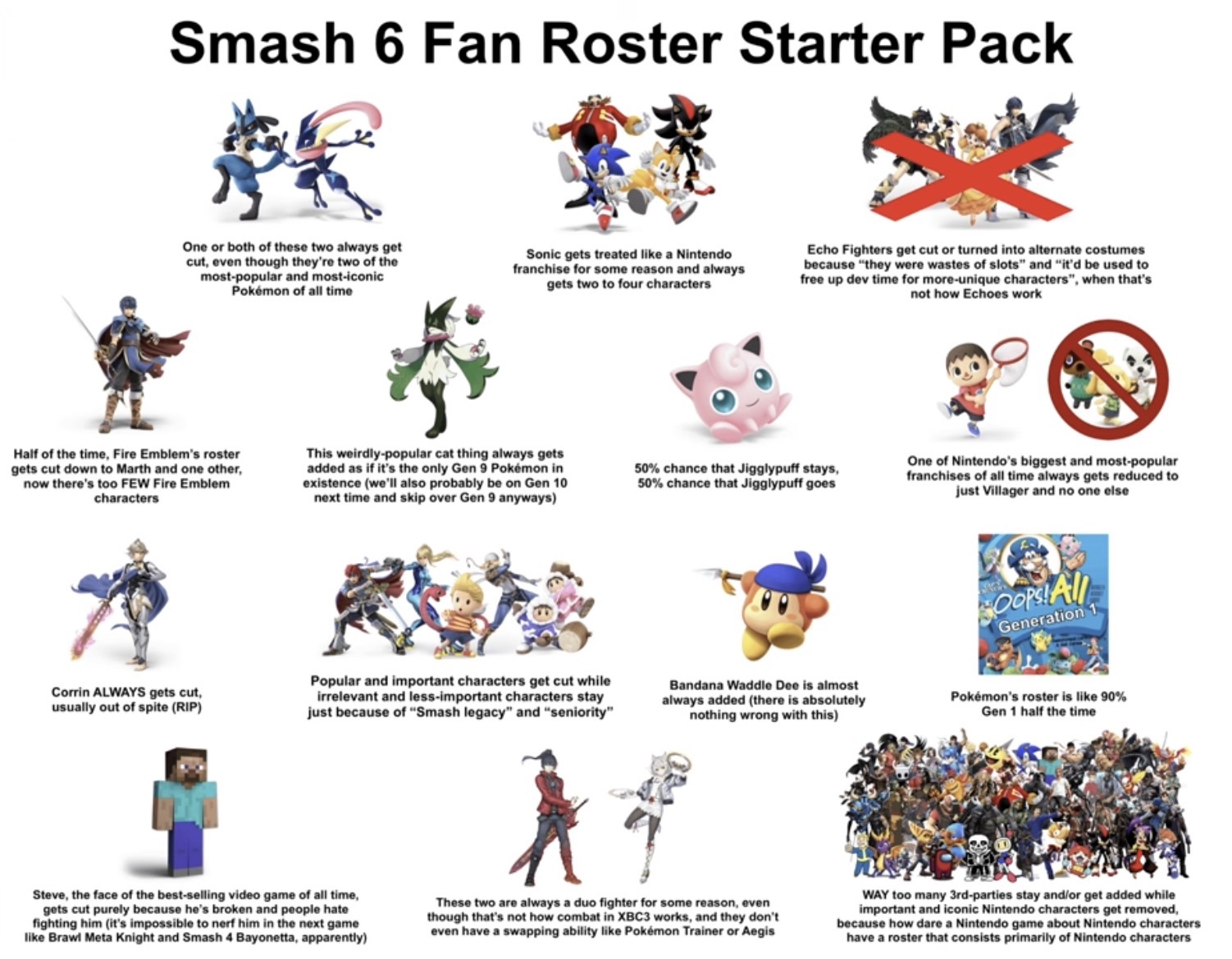 >>736426539Brawl has the best distribution for each franchise. No series feels like it has too few or too many characters as there is a maximum of four character slots going down a column on the selection screen in Brawl (although Pokémon and Zelda technically have more with Pokémon Trainer and Zelda/Sheik respectively).Sakurai wanted to avoid over-representing certain series pre-Ultimate, which is probably one of the reasons why Wario wasn't added in Melee. Brawl also has nearly all of the characters you'd expect to see from each represented series. The only one I'm iffy on is Metroid with Zero Suit Samus who felt like they wanted to add someone from Metroid, but felt Ridley was "TOO BIG" at the time so they just added Zero Suit Samus because of Zero Mission. There's also cutting Mewtwo who waa the only character I feel was an unjustified cut. Jigglypuff should’ve been the one to sit out Brawl, not Mewtwo. That also begs the question, would people ask for Puff to come back in Smash 4?