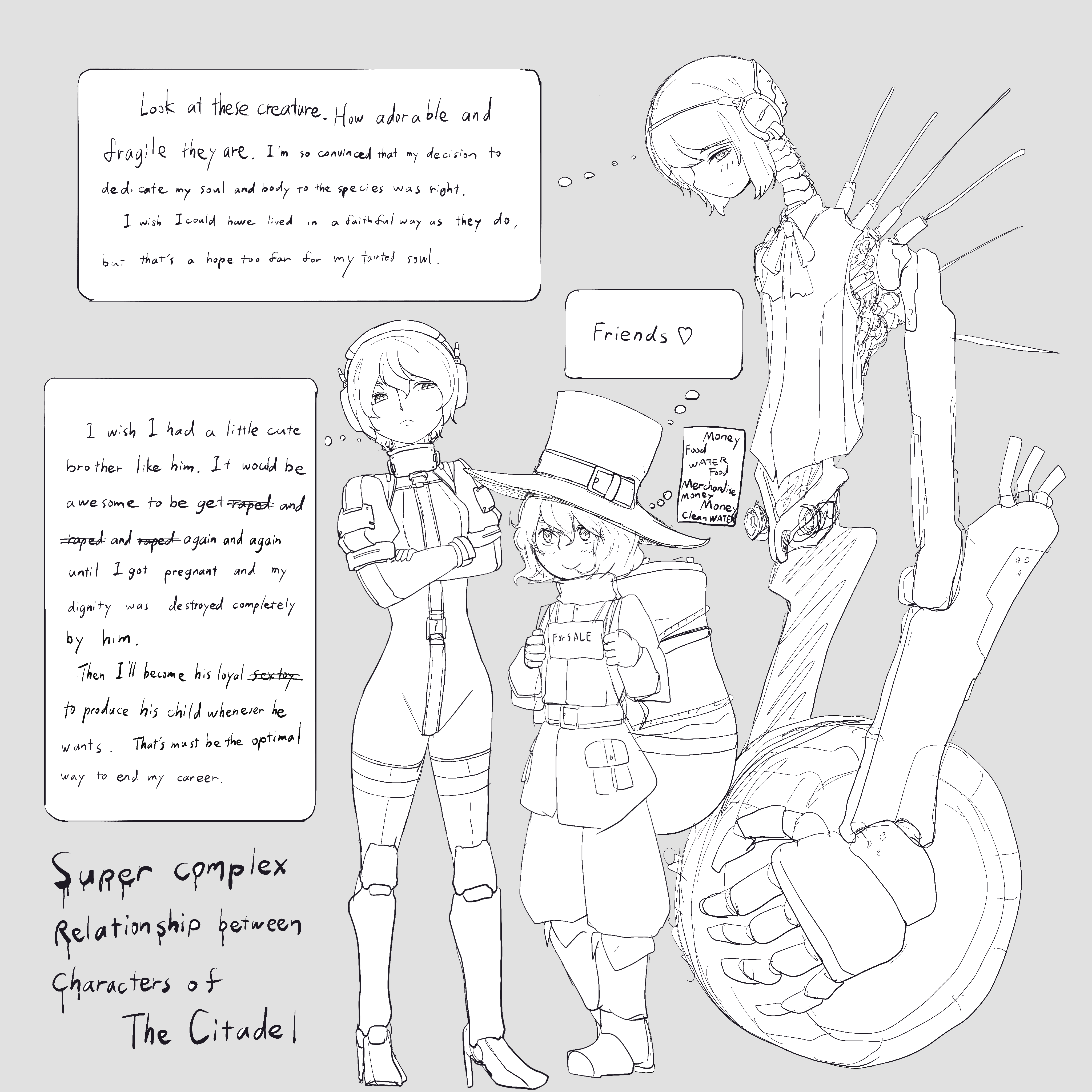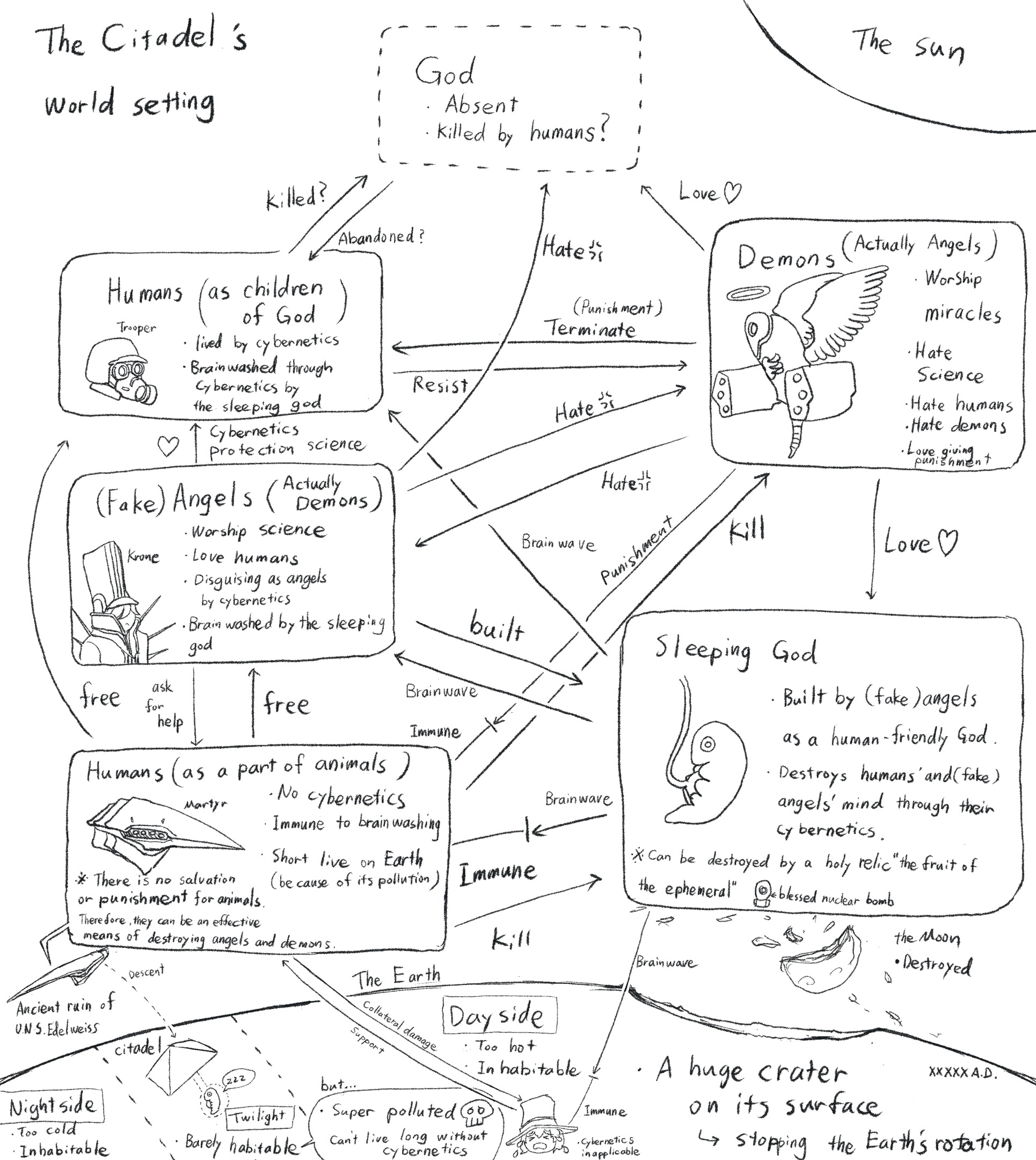 >>736442623Kinda but not quite. As far as I understand:>God leaves for some unknown reason>Angels think its because humans have become too sinful, but theres no evidence>Angels start passing judgement on mankind, thinking that if they only leave the good human behind God might come back>At this point in time there are 10 billion humans, and we have over a hundred space ships>Elulu is a cripple>Martyr-chan is a degenerate, and she feels super bad about her brother>She comforts him the way only a woman can, against his will>Elulu was so pure he would had been one of the 144 thousand the angels didn't punish>The angels were going to punish Martyr-chan, but Elulu jumps in her place>Angels get so pissed they instead torture Martyr-chan eternally, killing the twins she was pregnant with>Demons look upon mankind and take pity on them, and start helping them>They cannot survive helping humans and start falling apart, so they have to put cybernetic implants>Humans in turn take pity on the demons, who have been selfishly dying by helping them, and implant themselves with cybernetics too, both in admiration and to share their pain>A bond of eternal love is born between demons and humans>Earth is nuked to shit to try to stop the angels, gets tidally locked and fucked>Demons save Martyr from the angels, since she is technically immortal>Humans sacrifice themselves to become the brain of the spaceships, this is seen as a great honor to help the demons>The last ship remaining crashes into earth, becomes the citadel>Demons try to recreate a new god to appease the angles, maybe that will get them to leave>This would be a human and demon friendly god>Citadel 1 happens