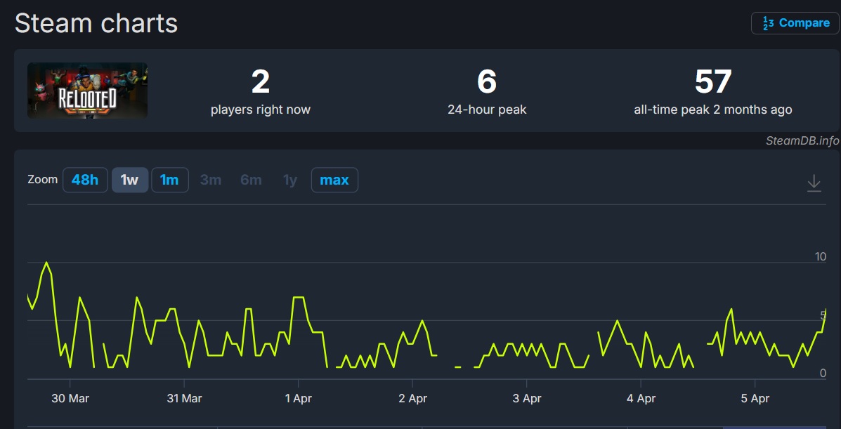 >>736429174If two months ago counts, the all-time peak player count for Relooted was 56 people