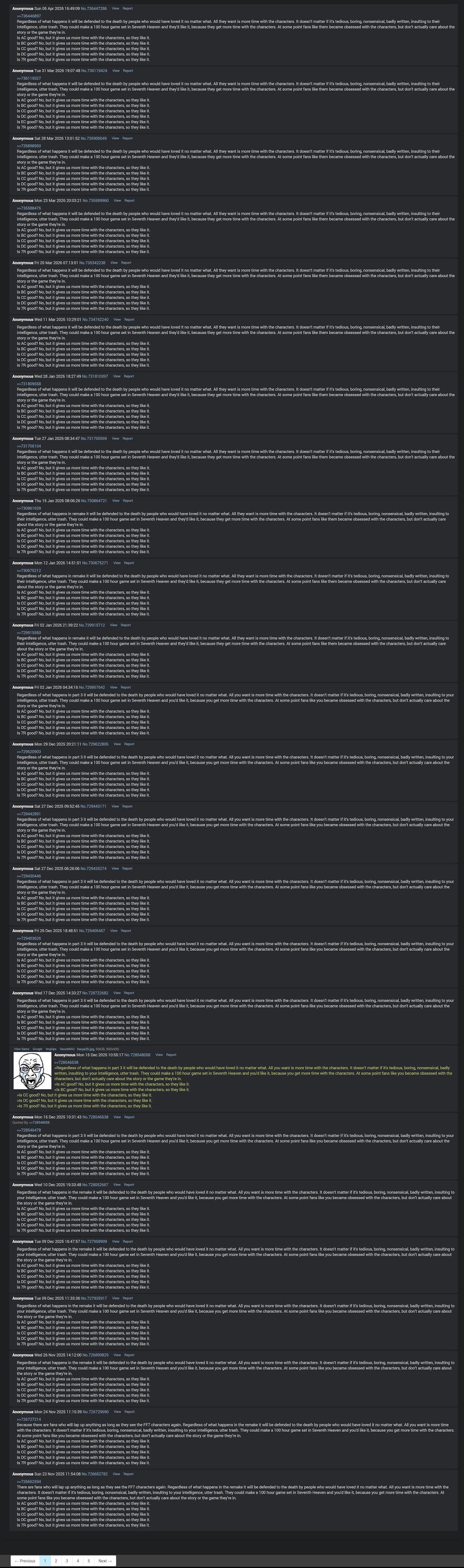 >>736446897Regardless of what happens it will be defended to the death by people who would have loved it no matter what. All they want is more time with the characters. It doesn't matter if it's tedious, boring, nonsensical, badly written, insulting to their intelligence, utter trash. They could make a 100 hour game set in Seventh Heaven and they'd like it, because they get more time with the characters. At some point fans like them became obsessed with the characters, but don't actually care about the story or the game they're in.Is AC good? No, but it gives us more time with the characters, so they like it.Is BC good? No, but it gives us more time with the characters, so they like it.Is CC good? No, but it gives us more time with the characters, so they like it.Is DC good? No, but it gives us more time with the characters, so they like it.Is 7R good? No, but it gives us more time with the characters, so they like it.