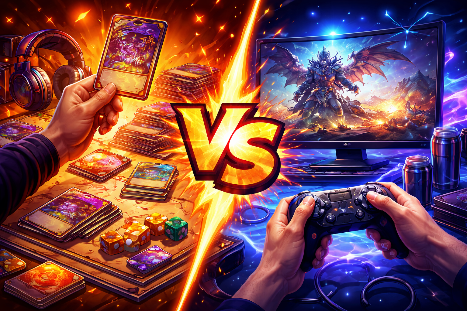 Apologies for the AI image. Which one would you prefer? You could put it in the middle and say you could play something like Yugioh Master Duel or MTG Arena but some people like the face to face interaction