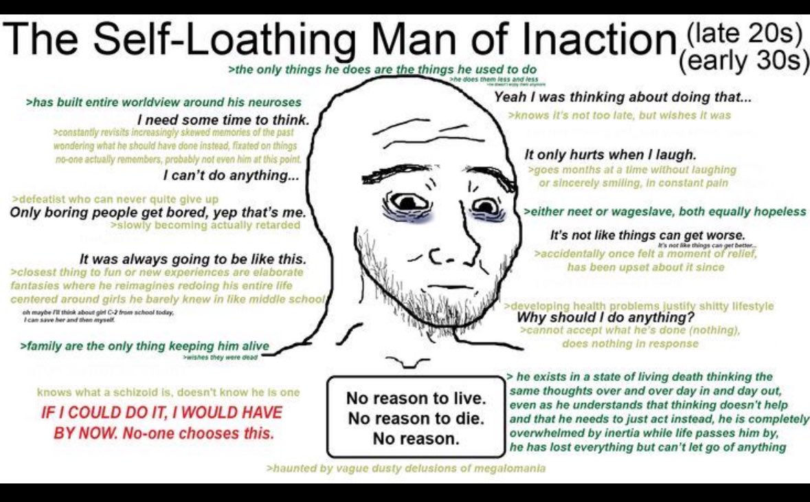 >>736471263>>736473298>>736478464>>736477903>>736471427I feel like men like this were supposed to die in their 20s or earlier from Typhus,Small Pox, TB or get levied into conscription and be a nameless death in some musket or cannon volley. And the suffering felt today is from the natural order delivering punishment for humanities collective hubris following social intoxication off its own dopamine rush stemming from its technological and medical advancements. We all have a part to play in this opera called life and we missed the casting call. Too smart to be a ignorant wage slave sipping booze with 5 mouths to feed in a trailer home like most lower class males. But too stupid and unambitious to blaze any trails, or figure out any dreams to work to realize.