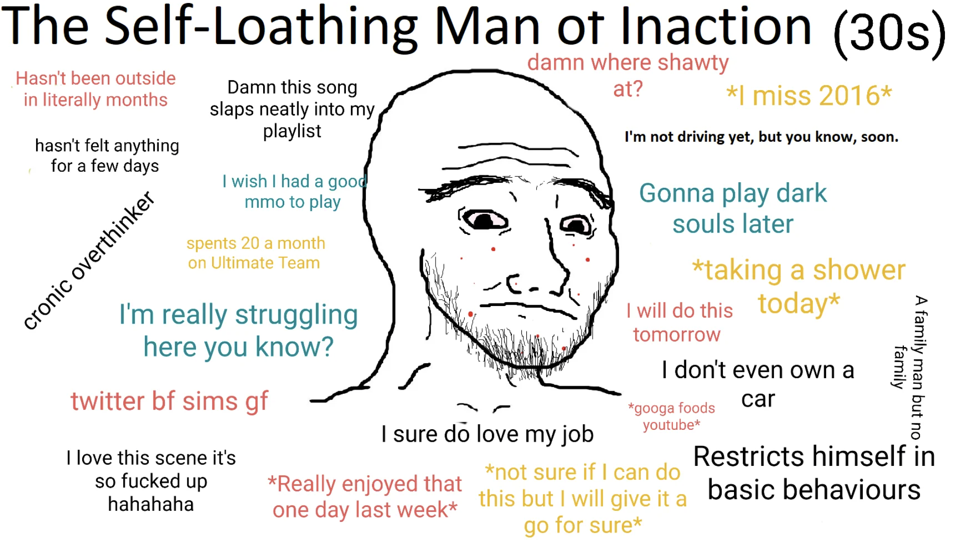 >>736471545The only thing that would've got bingo is the hygeine and that's just because I'm too busy doing shit sometimes. I still make efforts toward it because I feel like shit when I don't.Still doesn't make the general situation any better, still think I'm doomed. Once you're touched a bit by postal head demons it's kind of hard to try and be normal.