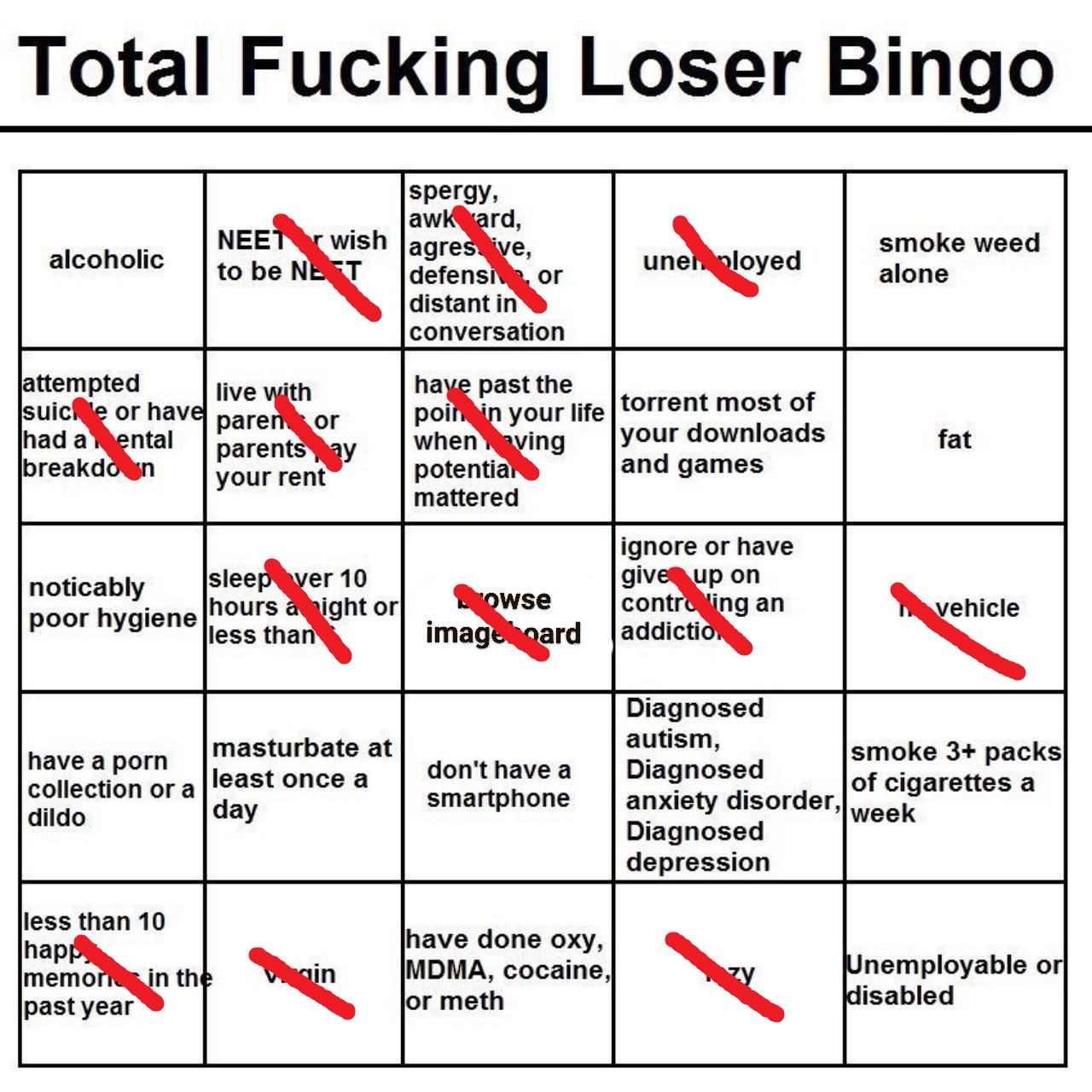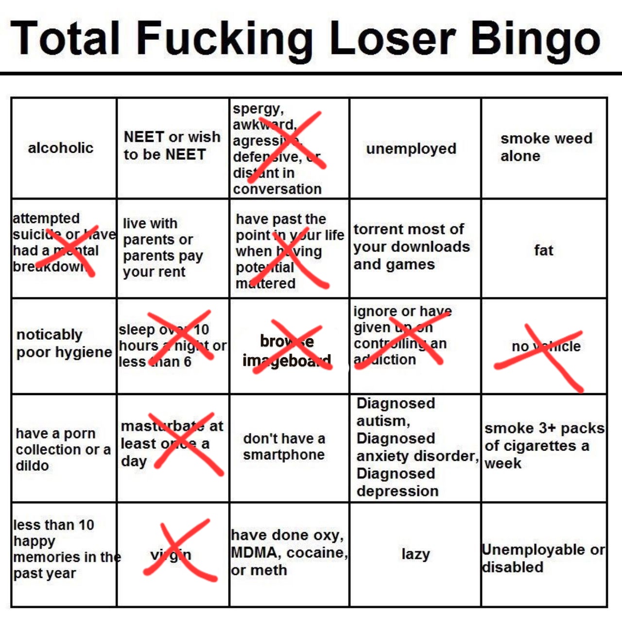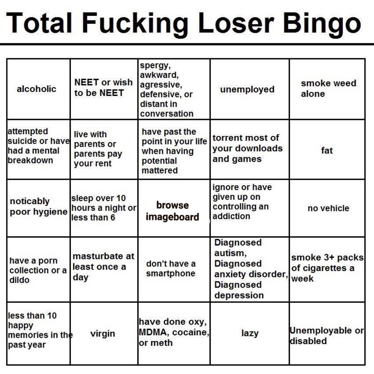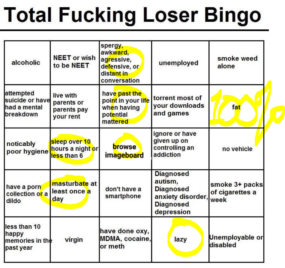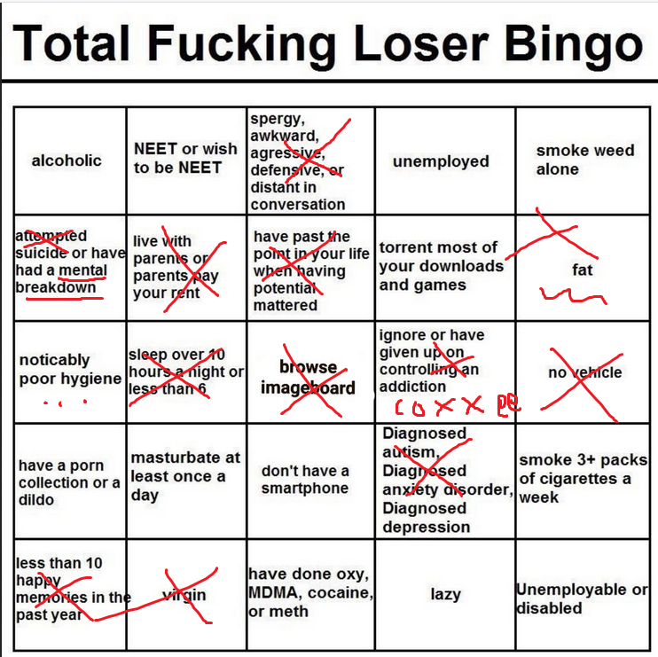 >>736471545>unemployed NEET >Lazy>have to torrent gamesOk that makes sense if you are brokeBut how the fuck on the same bingo card are you gonna have>Buys cigarettes,Booze and Cocaine/drugsVices are fucking expensive. Thats why itd called the poverty industry cause it keeps you in poverty with how much you spend. If you are a broke neet you are not spending 10 dollars a day for a liter of booze 10 dollars for cigs and 40+ bucks on grams of drugs. That easily can rack up to over 150 dollars a week depending on how bad your addiction/ tolerance is.No that shit is unironically for wagies/blue collar types.