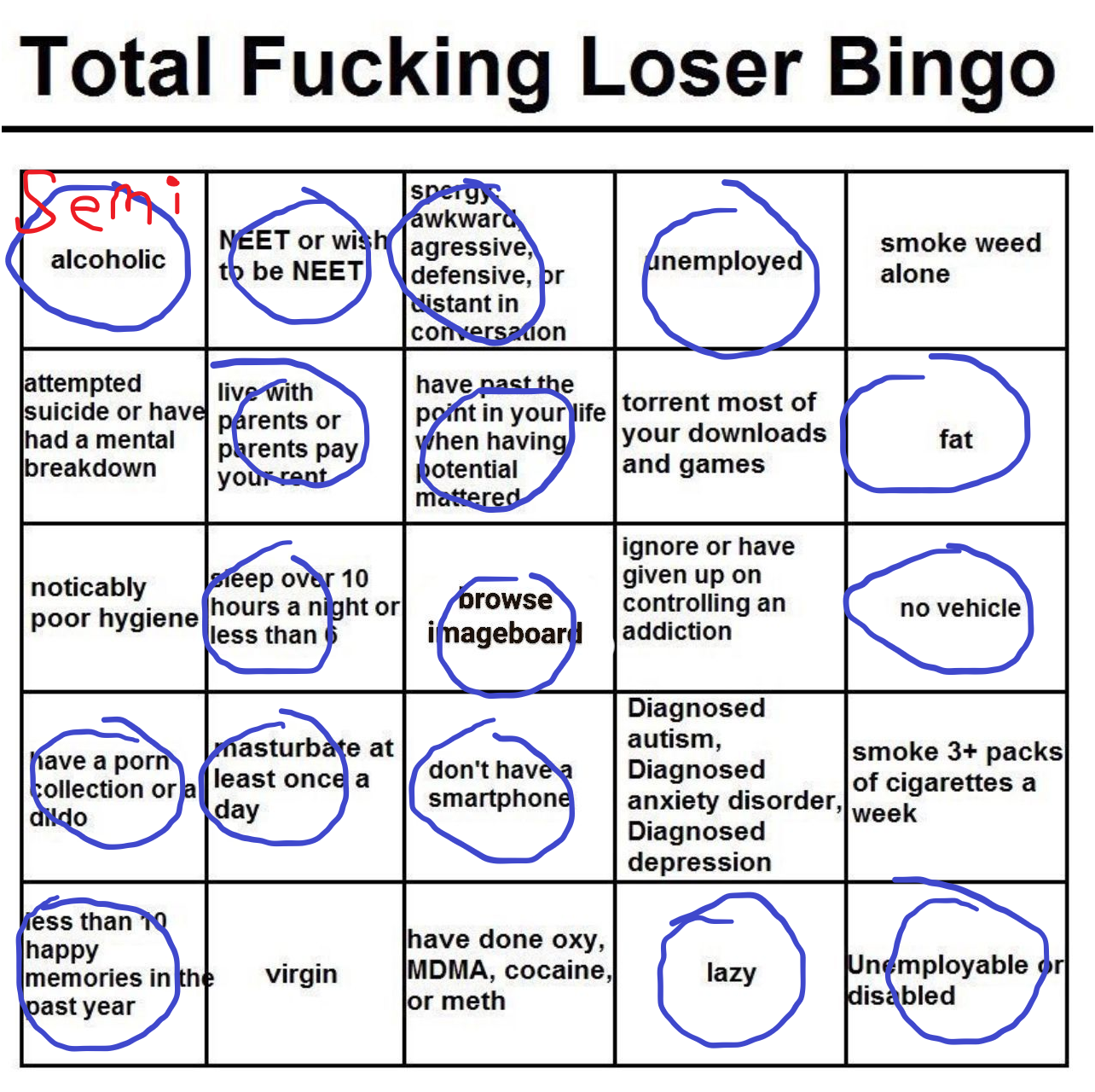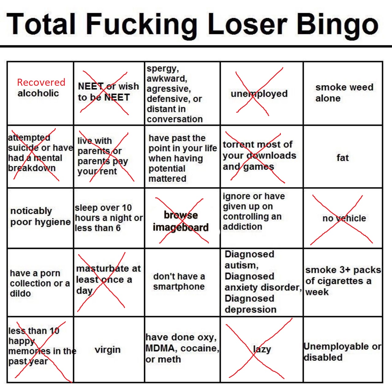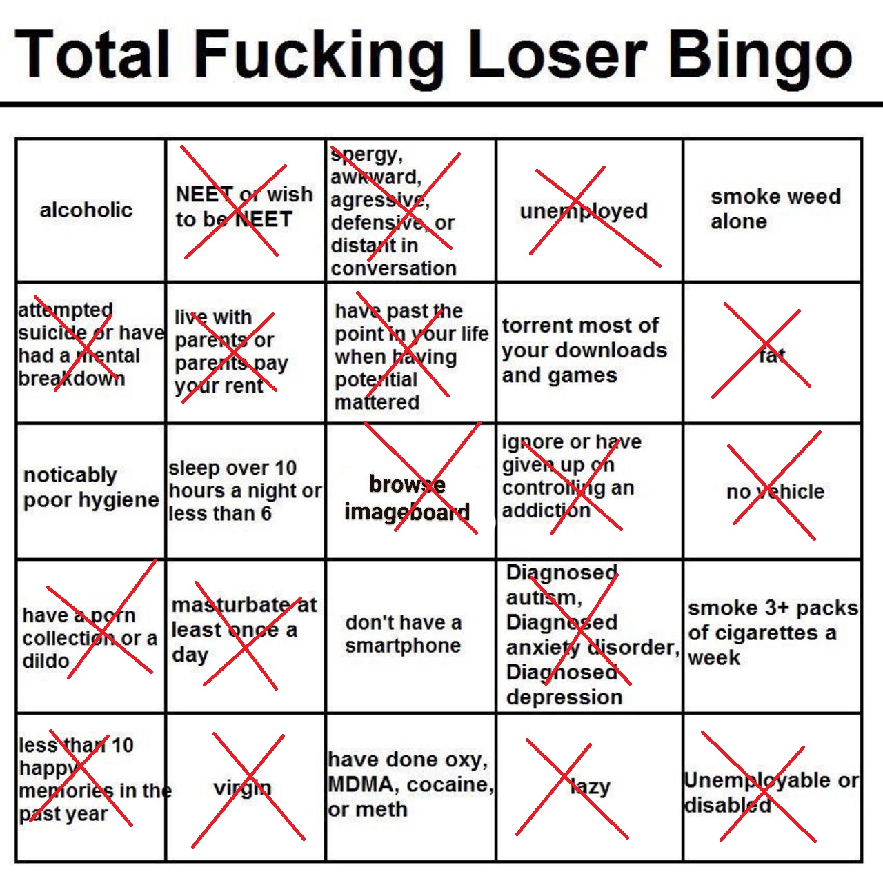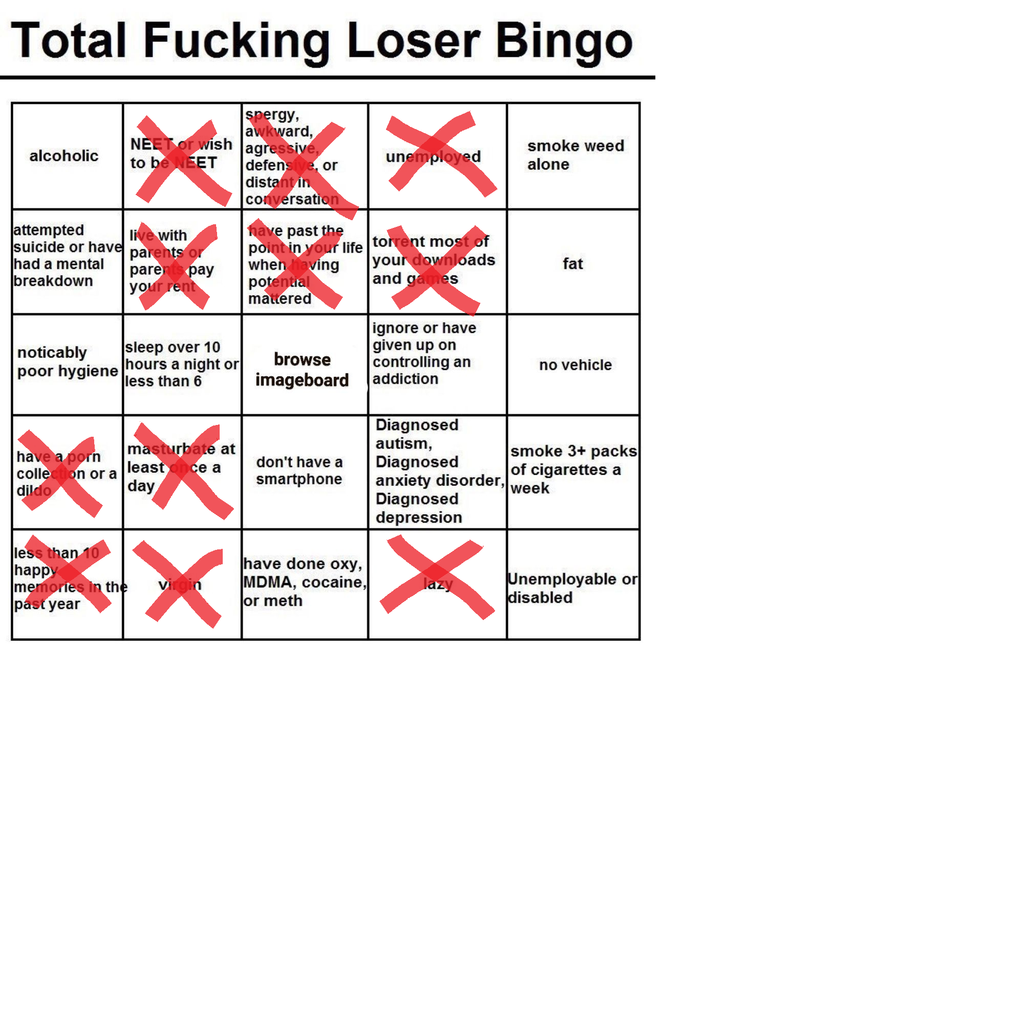 >>736471545>unemployed NEET >Lazy>have to torrent gamesOk that makes sense if you are brokeBut how the fuck on the same bingo card are you gonna have>Buys cigarettes,Booze and Cocaine/drugsVices are fucking expensive. Thats why itd called the poverty industry cause it keeps you in poverty with how much you spend. If you are a broke neet you are not spending 10 dollars a day for a liter of booze 10 dollars for cigs and 40+ bucks on grams of drugs. That easily can rack up to over 150 dollars a week depending on how bad your addiction/ tolerance is.No that shit is unironically for wagies/blue collar types.