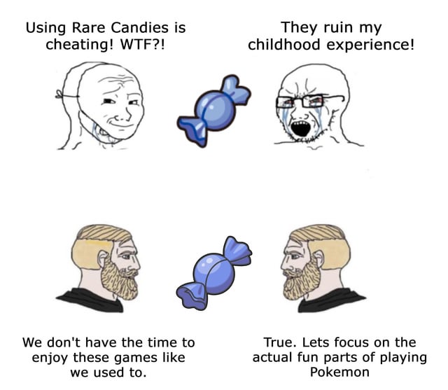 >Certain pokemon cannot attack or have extremely limited move pools at low levels>Intentionally makes training them harder because the payoff is a very strong pokemon after>Necessitates swap training usually, or giving them your one XP share>NAH BLUD I'LL USE RARE CANDIES BECAUSE I DON'T WANNA GRIND LOL