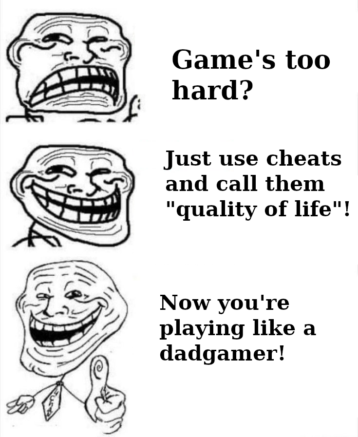 >>736476872A cheat only qualifies as "quality of live" if it doesn't affect anything that tests your skill in any capacity. Teleporting to a boss is fine, if there are no enemies inbetween to test your skill to get past them, and also no platforming sections to test your platforming skill, no puzzles to test your problem-solving/logical thinking/perception/knowledge.>but what if I have passed all these tests already, and die to the boss. Do I have to do it all again? That sounds awfulDepends. If these tests are so easy for you, that doing them again doesn't feel like a genuine challenge, but like tedium, they are pointless. Just teleport to the boss. But it may also be possible that, while you passed the test at some point, you only did so by the skin of your teeth. You aren't yet able to do it consistently. You should man up and take the test again. A lot of it also depends on what the primary focus of the game is. In the case of a platformer, where the main challenge is the platforming and bosses are more like a fun little distraction inbetween, you should definitely do the platforming section again, if somehow you died to the boss. If you don't want to, it is a bad platformer or you don't enjoy platforming. Or you have done it so many times already, that it becomes boring, but in that case how the fuck are you dying to the boss so often. Either the boss is completely overtuned (bad design) or you suck at boss fights (look for a platformer with easier/no bossfights). The necessity to use "Quality of live"-cheats is often a result of either the game being not well designed in some parts, or generally, or the player not being honest with himself in regards to what kind of game he truly enjoys.Sometimes players use cheats to make sections easier that they think are too difficult and call it "quality of live" but the reality is, that these people are simply not honest to themselfes with their level of skill. They are simply cheating.