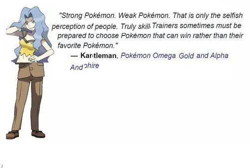 >>736478312Strong Pokemon.Weak Pokemon.That is only theselfish perceptionof people.Truly skilledtrainers shouldtry to win withtheir favorites.