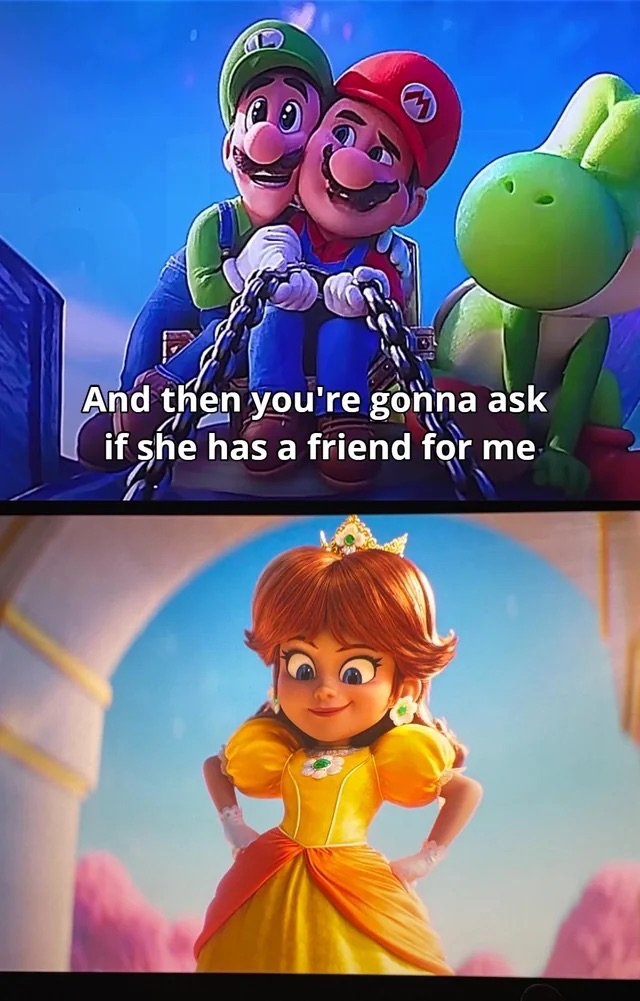 >>736486232Since in the movie it's very clear that peach likes Mario to the point where she gets disappointed that Mario went in for the handshake over the hug.I wonder how they will handle Daisy Will she just instantly be down horrendous for Luigi? To the point where shes actually off-putting to Luigi for a good portion of the film?