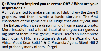 >>736500486>everything's gotta be an allegoryOFF is not an allegory, people are just retarded theorists who took the intentionally mind-bending final area as proof that the story is a puzzle that needs to be solved. They couldn't accept the idea that a french artist made a weird world for the sake of it being a weird world, and did a basic subversive concept of secretly playing as the villain the whole time. The dev cites Killer7 as his inspiration, but all the fags on tumblr never played that. They were all "I'm 13 and this is deep" kids who thought they stumbled on high art.