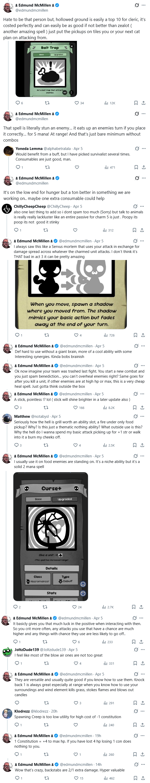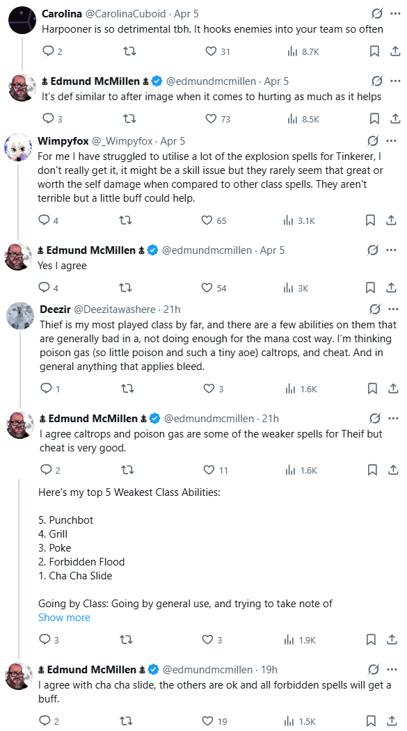 >>736503097>>736503230the most baffling to me are some of the Mage self-injure spells (that aren't classed as Forbidden), like Corrupt and Deal with the Devil - they are both complete garbage.>hurr durr permanently lower a random stat to get...15 mana!>...or +3 damage (temporarily lol)what the fuck was ed thinking???>S tier class according Edmund btw