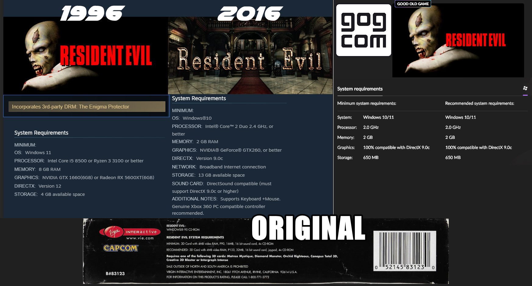 >>736504579this entire Resident Evil release feels like a psyop to sully Steamwhy release with DRM on Steam? just because you can? your pic is confusing. you should've put in parentheses what year it showed up on the storeor cut it out of the store's pages