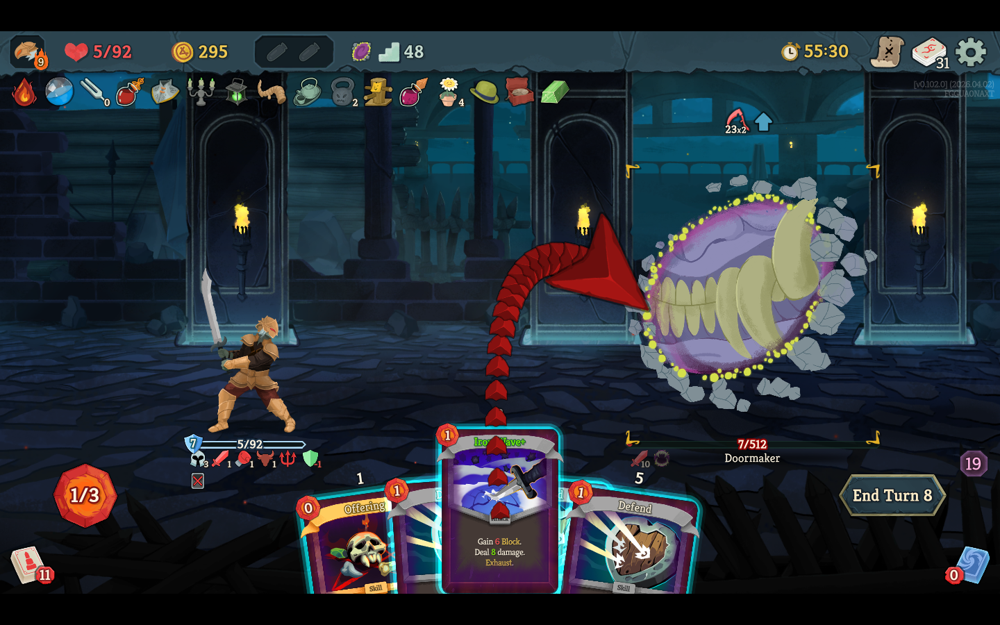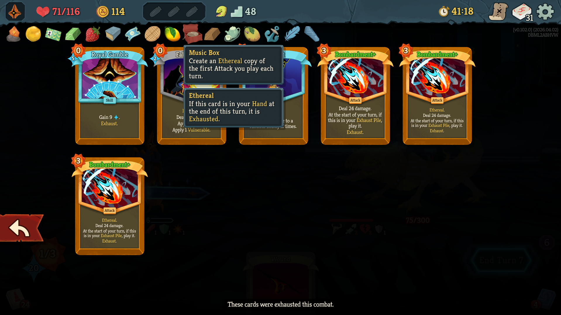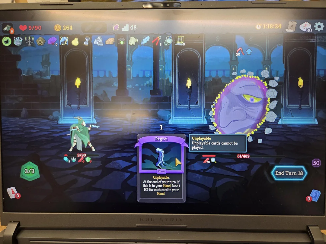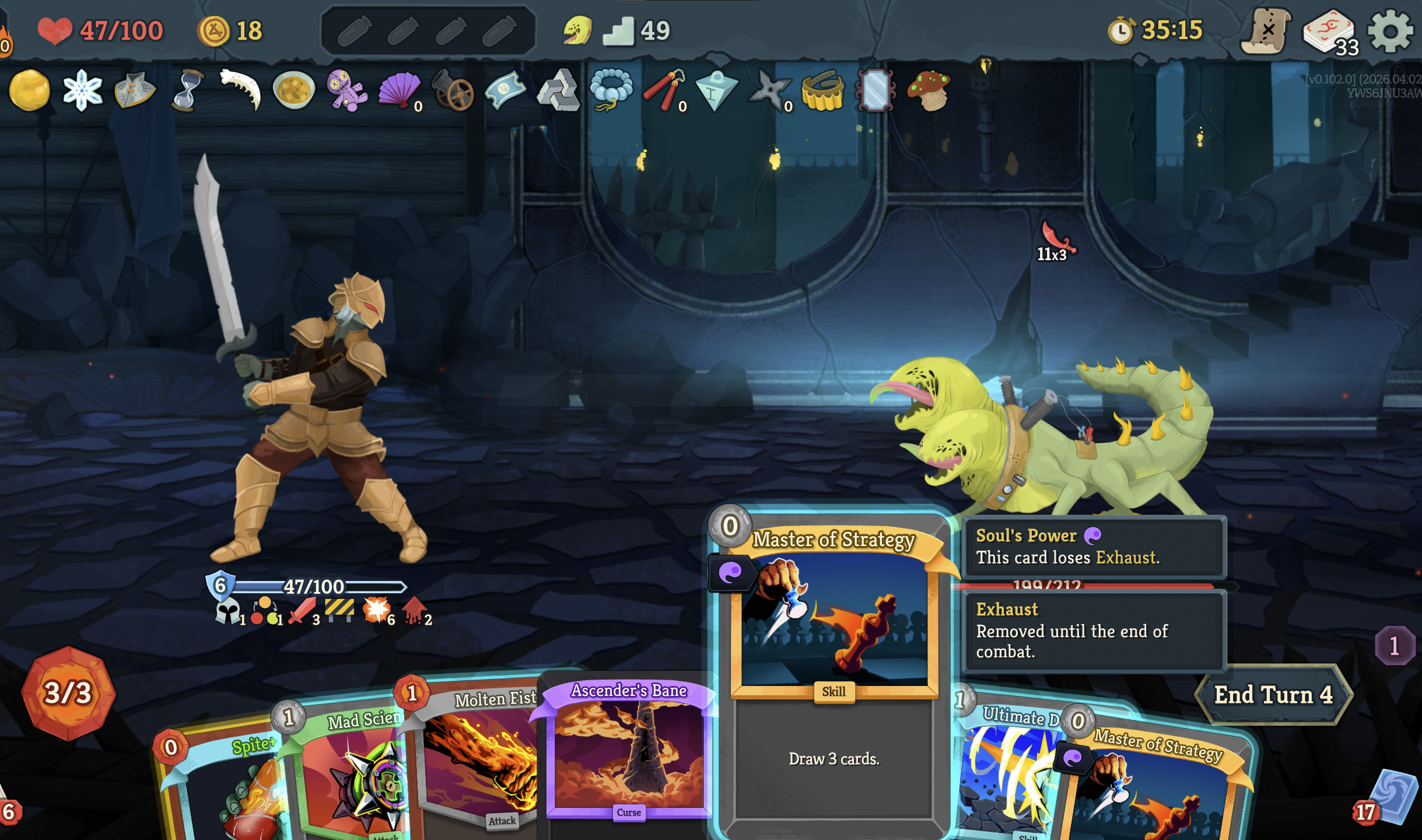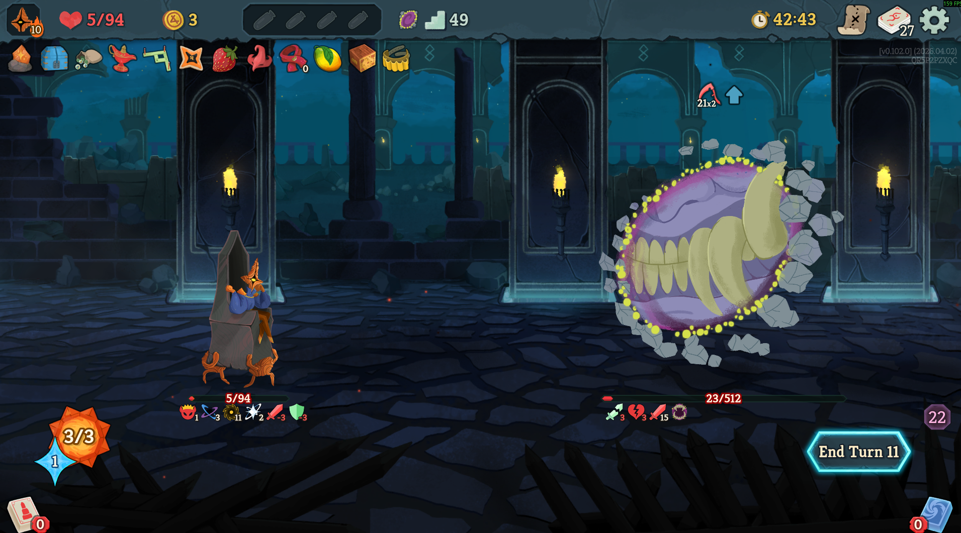 in the latest update he make all cards exhaust when you play them. prohibit you from drawing cards. and he takes 1 energy from you every time you play a card. all while hitting for 30 every turn