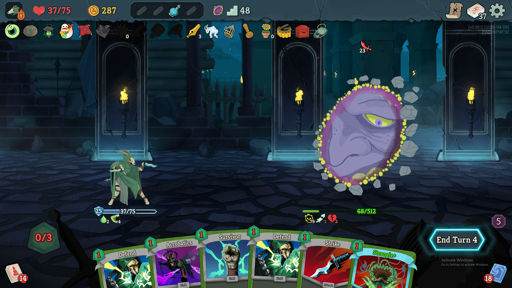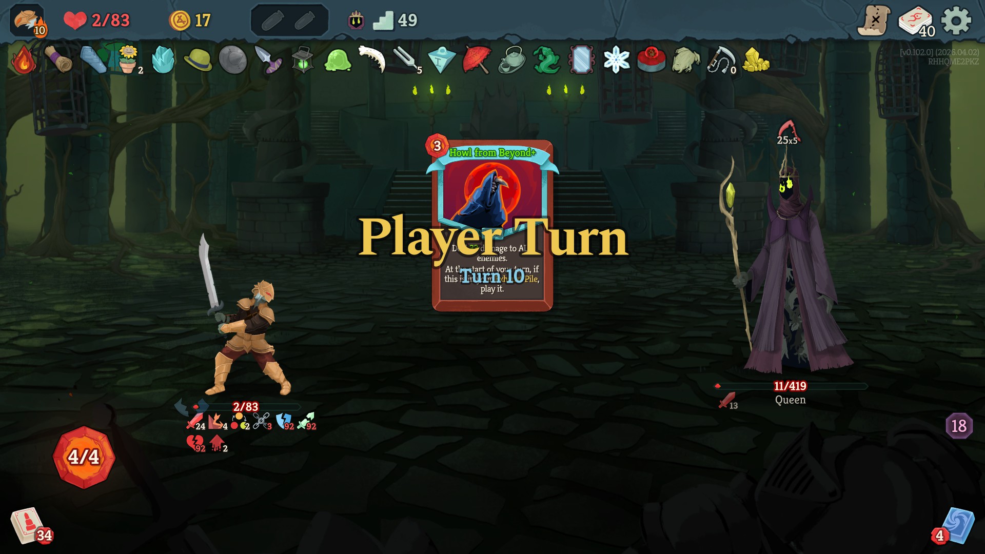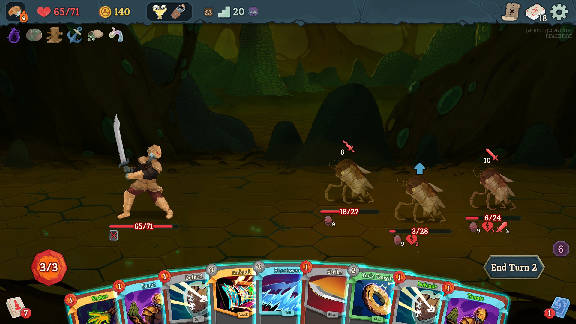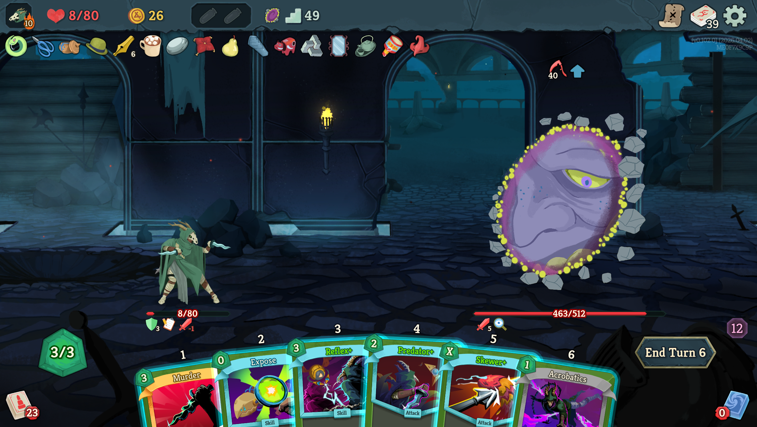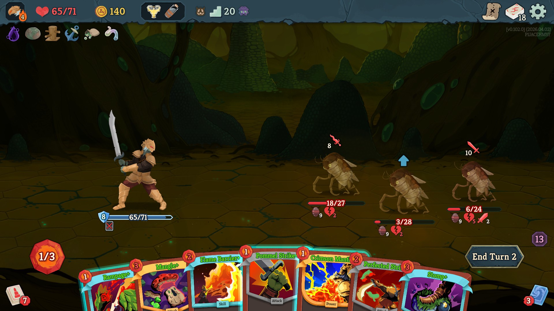 in the latest update he make all cards exhaust when you play them. prohibit you from drawing cards. and he takes 1 energy from you every time you play a card. all while hitting for 30 every turn