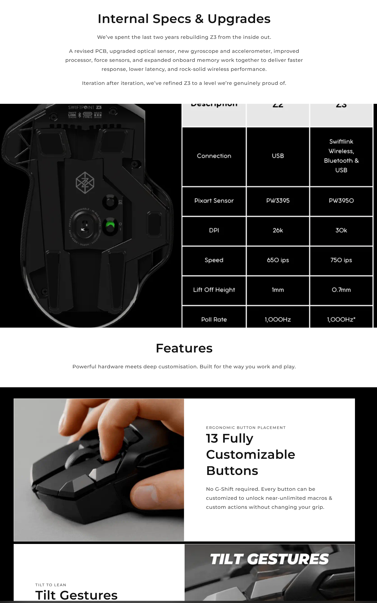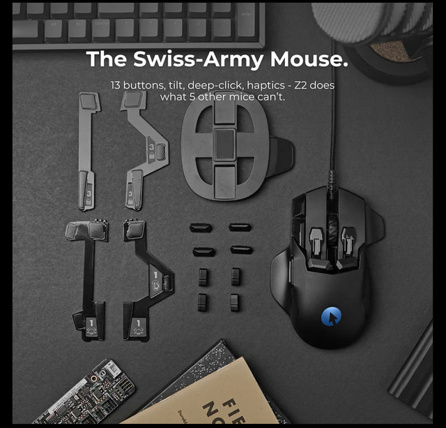 >>736581947Check out Swiftpoint >does it support layersYes, many complex ones. Also 5 of the main buttons (L and R click, the wheel, the fingertip buttons next to it) are analog pressure sensitive so you can have differing features at different levels of pressure. Atop that it has gyroscopic tilt functionality both side to side (there are 2 pairs of 'feet' included one locks out any tilting the other enables the side to side tilt. Also the circular thing there lets you sit it down as a joystick instead of a moving mouse and use front/back tilt as well for flight sims and the like )which are other inputs. I'fve used mice with large 'grids' and othe MMO types and the Swiftpoint is easily more ergonomically useful than any of them in my experience even if it technically has less separate buttons than some of the most button heavy grid types. Consider that some of the other buttons like the "knuckle" buttons are also dual featured like they have separate inputs for pressing down (easily using the first knuckle joint) and separately you can "pull it back toward you" for a different button usage entirely.>scroll wheel sideclicksUnfortunately nobody but I think Logitech can do that because they patented the fuck out of it, sadly. Still, I use the tilt functionality in any game that is FPS with "leaning" built in and its both analog and way fucking more useful. I would like the option of tiltwheel/sideclick but Logi pretty much owns that and rarely licenses it last I checked. Oh, one other reason I bought the Z2 was that it >supports Linux (admittedly in beta at the time)with its config software. The devs are pleased with the Linux users and plan to expand its Linux support for the next gen>Z3https://www.swiftpoint.com/products/swiftpoint-z3-eaThe Z2 is great but its one main downside is that its wired and the cord isn't even removable but they're fixing that with the next generation. Z3 has all Z2 features and more, including wireless
