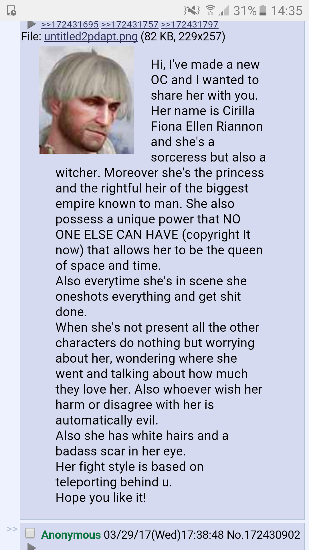 >>736545564If your default opinion isn't that Ciri is fucking dogshit then you aren't intelligent enough for the Witcher