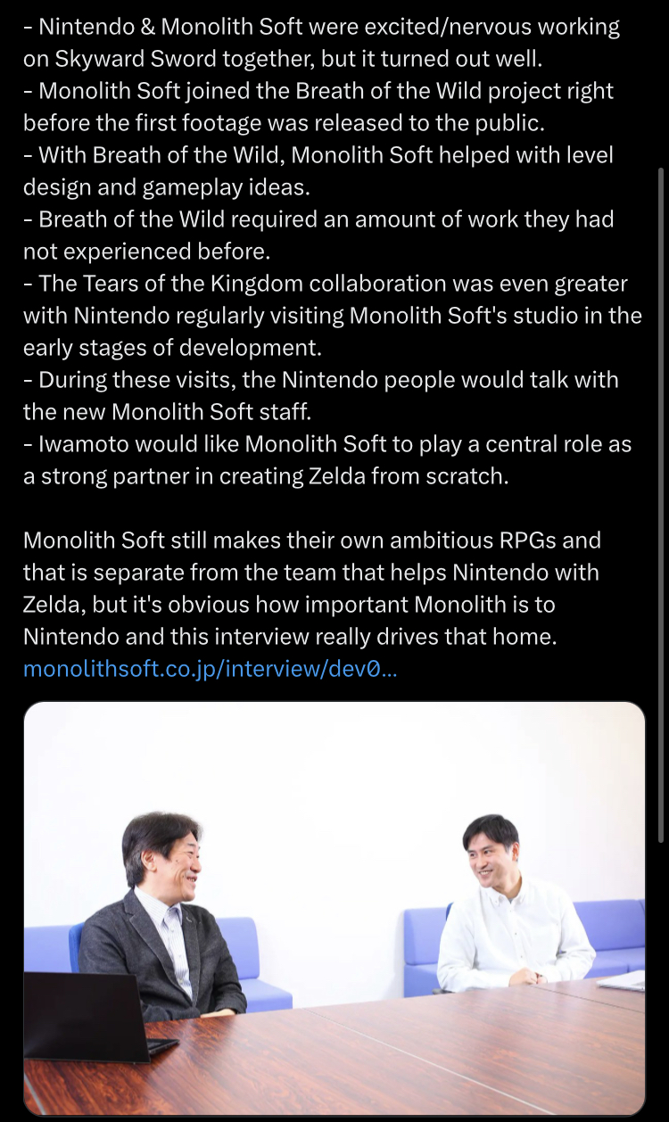 >>736575985It's Monolith Soft doing it, isn't it? They revealed more of the people that worked on Zelda titles and their roles, and removed the recruitment ad for a Zelda project (which was there since 2019).https://x.com/MONOLITHSOFT/status/2040963946690289882So instead of a Grezzo upscale, it's a whole new take on a Zelda done by someone outside of Nintendo's primary development team.