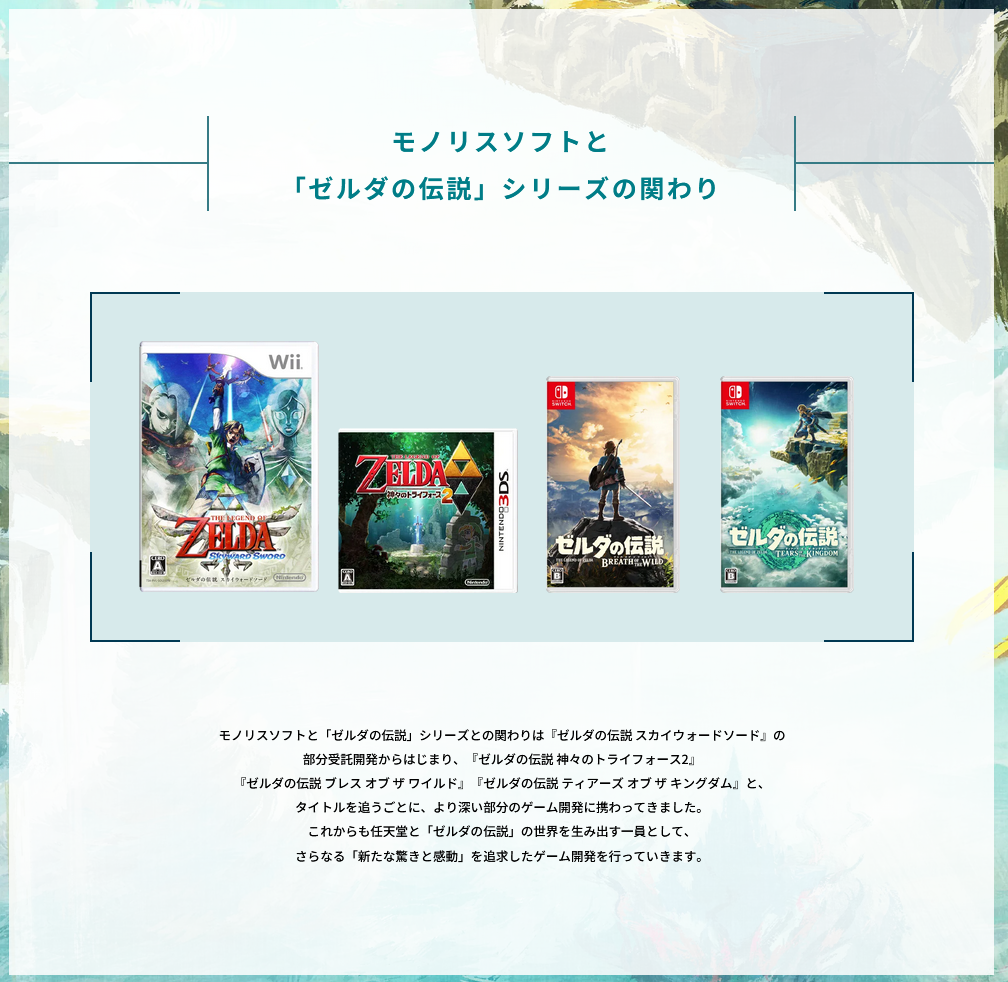 >>736580404https://www.monolithsoft.co.jp/recruit/https://www.monolithsoft.co.jp/interview/dev01/index.htmlThere's a reason why Monolith is suddenly advertising how much of a role they've had in Zelda games. And posting interviews with various devs on what their roles were.They're working on a new Zelda, and a big selling point will it'll be more led by Monolith than Nintendo.