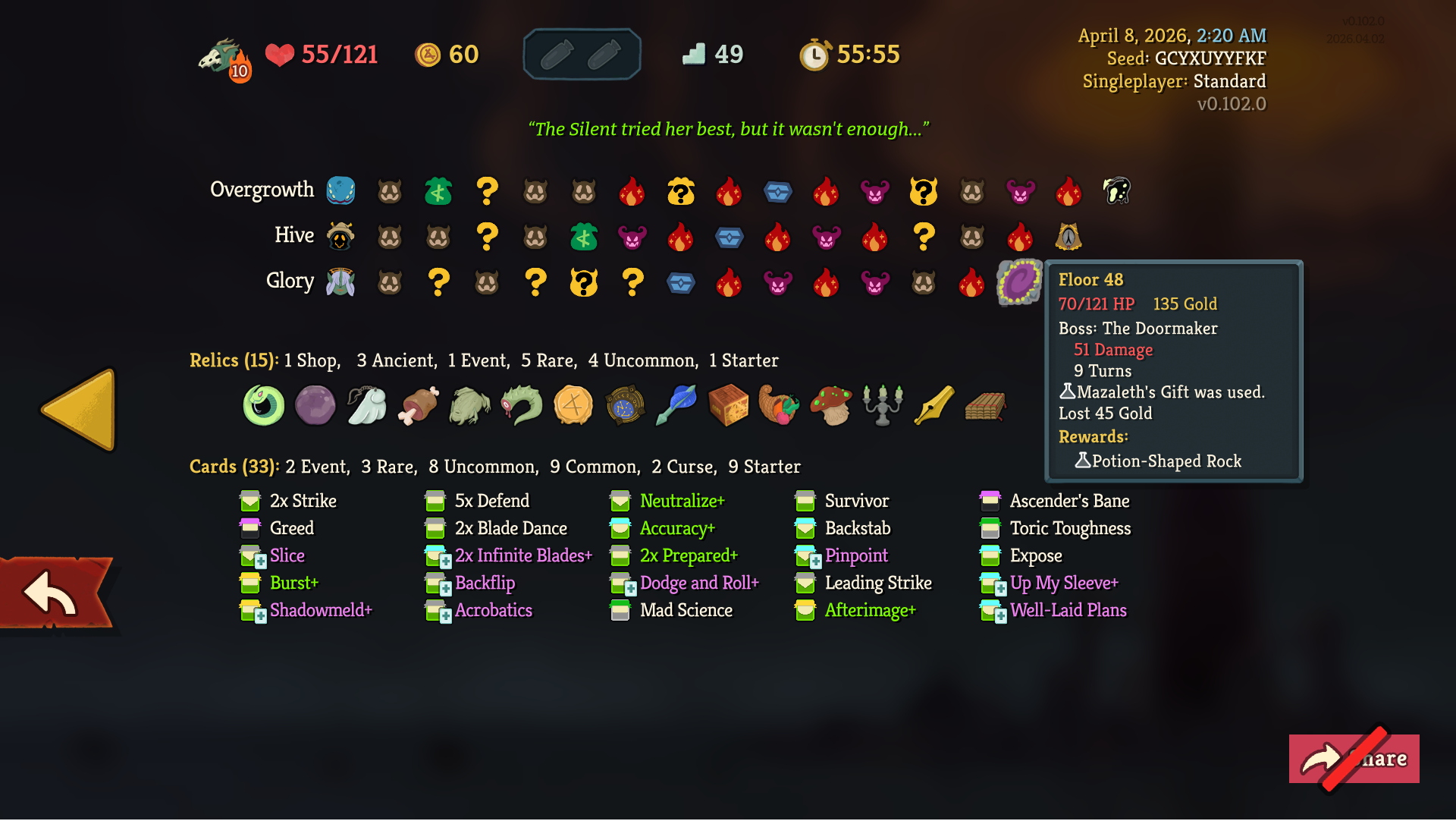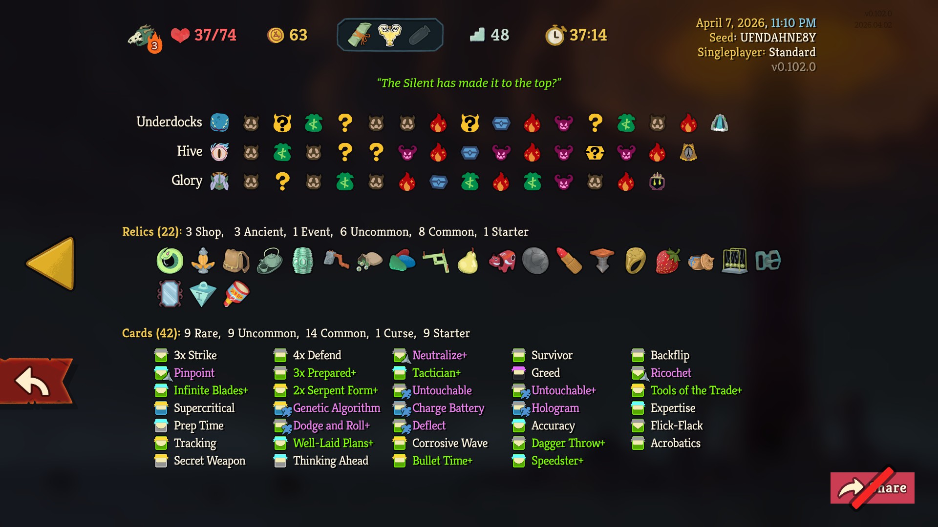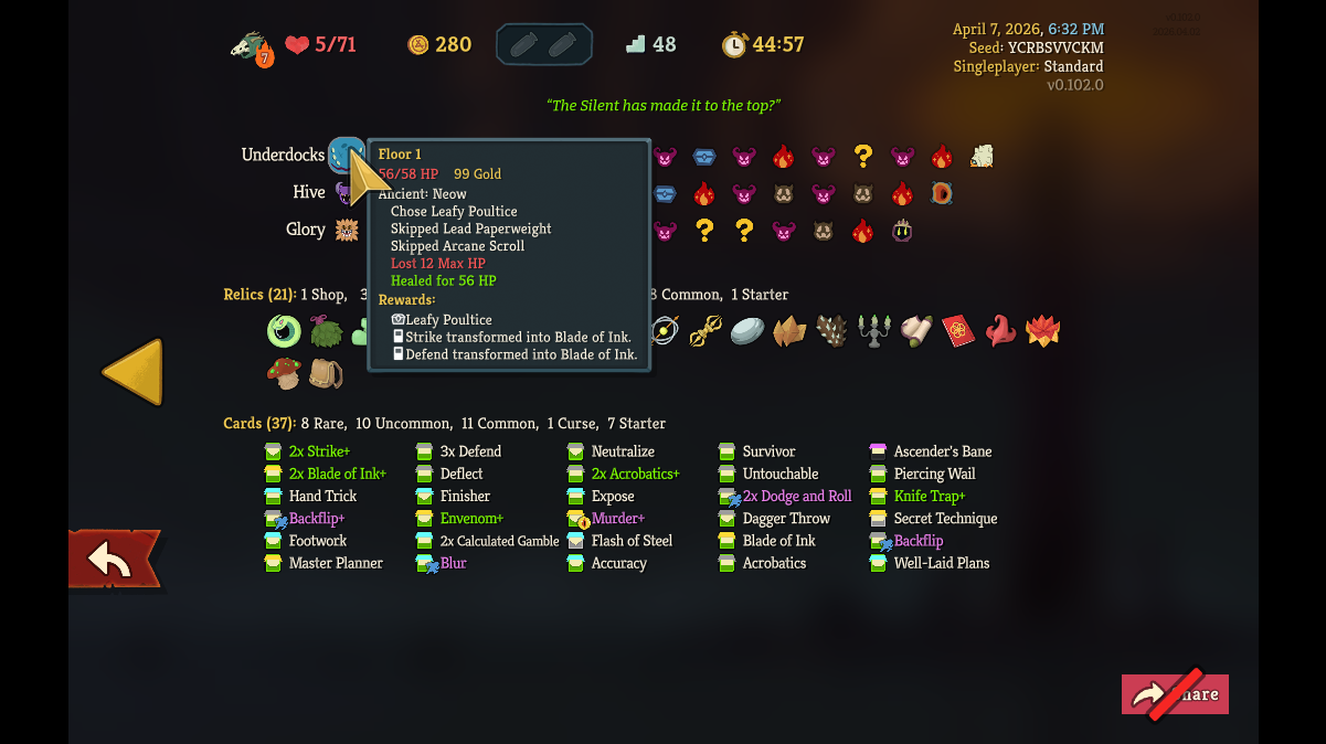 Played with this seed on Silent asc 7>double ink blade>you start double ink bladeGo have fun