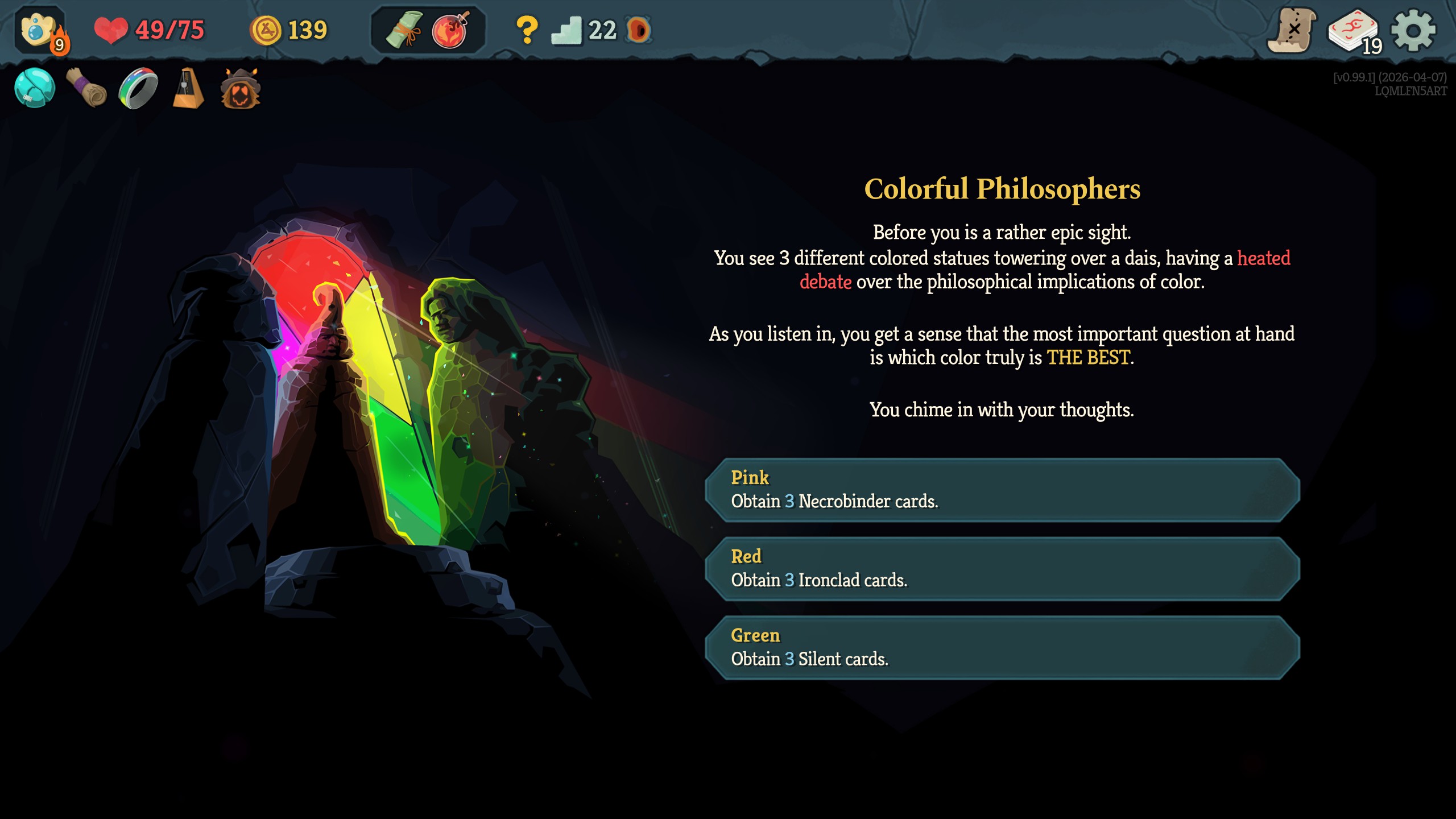 >trading Max HP for battle advantages>weighing the benefits of gaining strength now, or more strength later>hellraiser being good without just going infinite>doormaker still a serious challengeThis was a fun run.