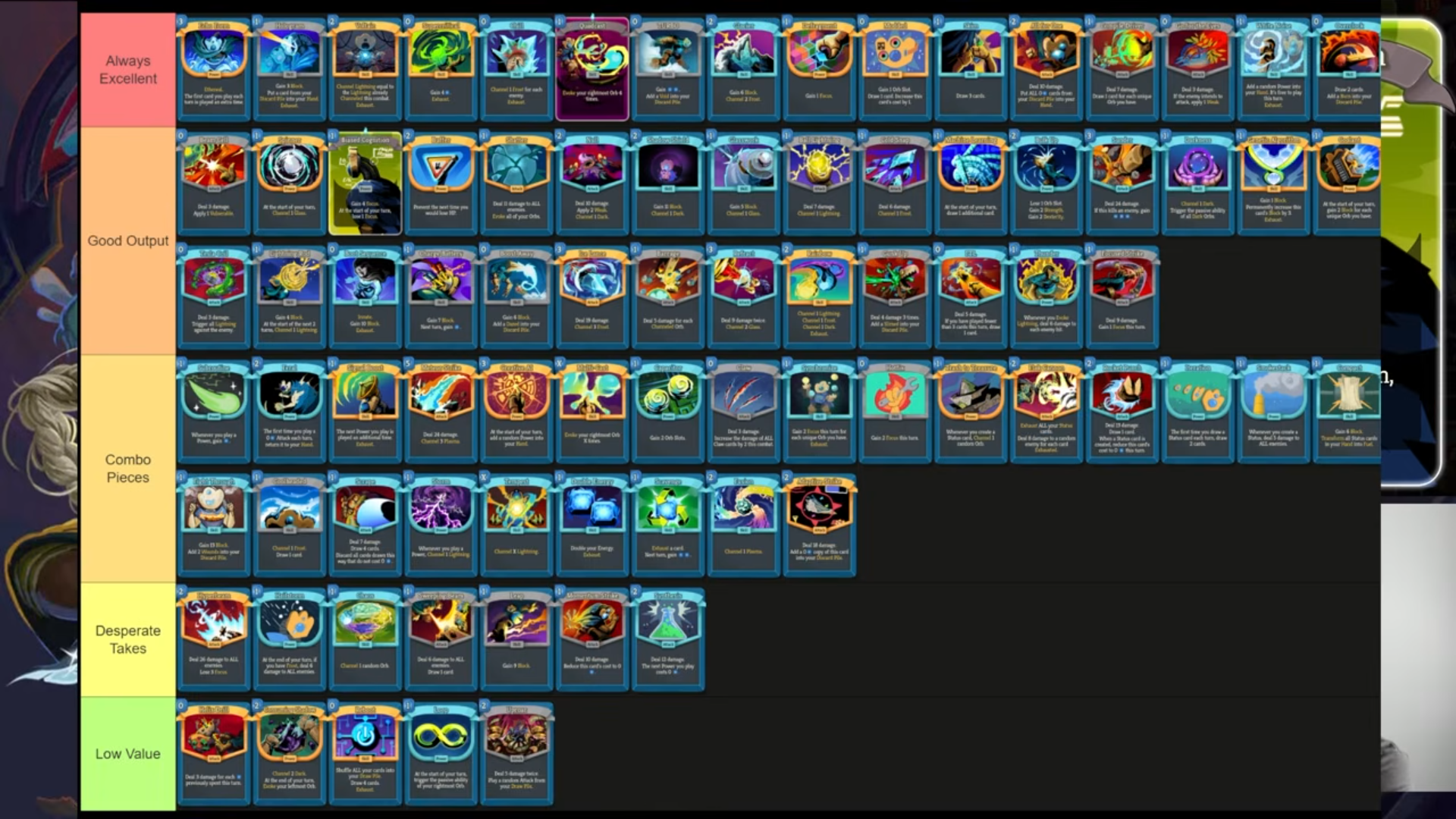 >>736611846I need to watch the video then.I imagine "All For One" always excellent he means on his own deck since it's useless without 0 costers.Gunk Up has never worked for me as well as barrage usually does (a card you can naturally slot in almost any orb deck in act 1), even on the status deck it's kind of low impact.Besides that, yeah, good cards on top, bad cards on the bottom, looks okay. I understand he slotted scaling pieces on the "combo" category as well. The list probably makes more sense when you listen to the commentary.