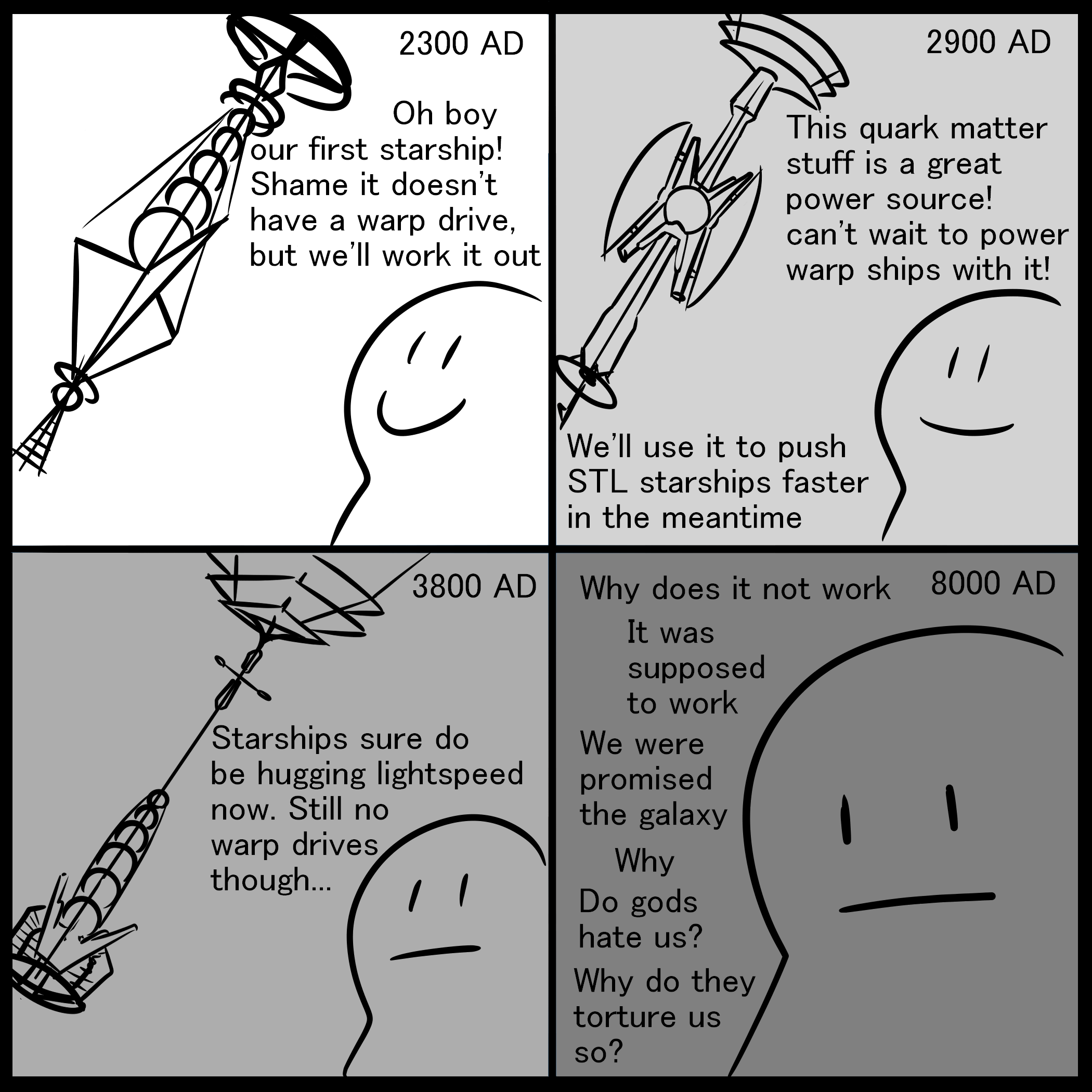 >>736598569dyson spheres, warp speed and all that was science FICTION that for some reason science worshipping faggots thought would actually be real at some point. like seriously they unironically thought that shit like star trek was gonna be real someday