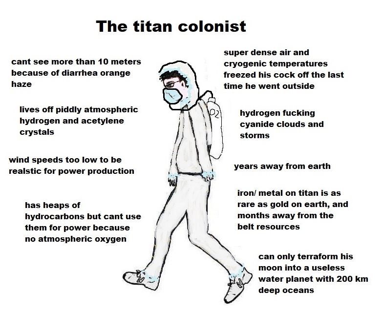 >>736603915This. On Titan literally all you would need to go outside is an oxygen tank and some warm clothes.