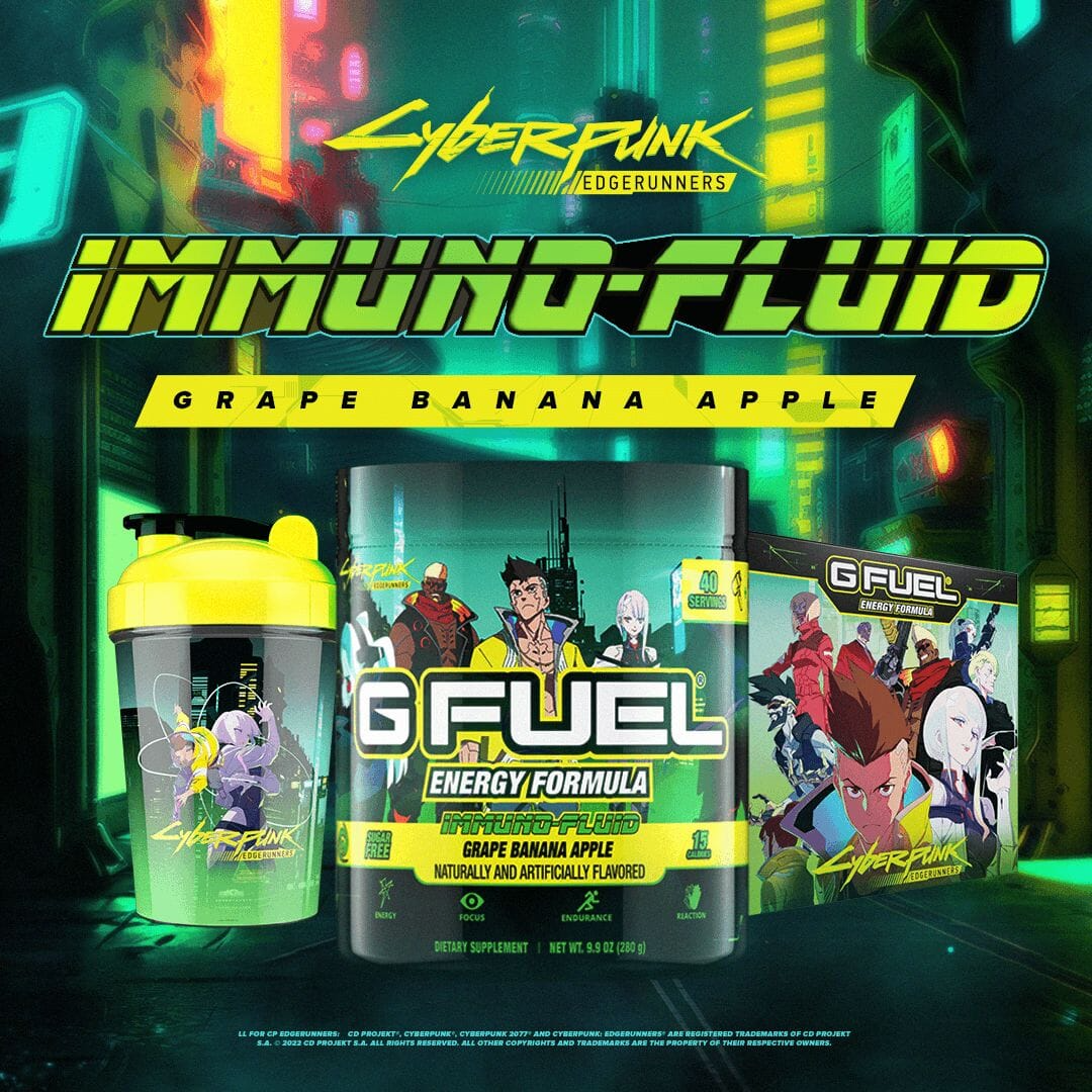 Me? I'm a big fan of the CYBERPUNK EDGERUNNERS Immuno-Fluid, nothing gets me pumped up for a gaming session with my chooms like a spoon full of that Grape Banana Apple flavor in my G-Fuel Shaker Cup, it staves off the Cyber Psychosis and gives me the edge I need.Use code ALPH1E at the checkout for your 15% discount on your next G-Fuel order.Fuel up. Power on. Collect the hype with G-Fuel today.