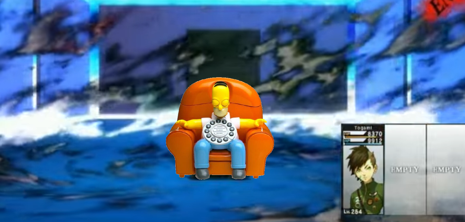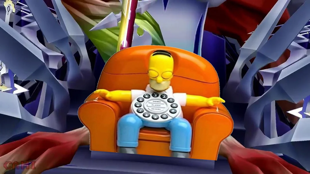 >as you approach you see Homer sat upon his seat>without provocation, you shoot him and he crumbles to dust>a brief respite at the end of your journey, but something is wrong>you begin to hear a light ringing>an enormous energy blast cleaves through the room, vaporizing you>You did not reach the Nuclear Phone