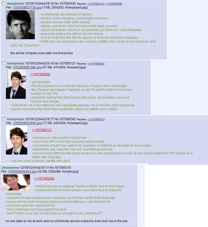 >>736620887>Then he called Todd to his office, handed him a controller and told him to just fuck around with a werewolf. Todd liked it, agreed to feature it in the game and even pushed to rework the Companions questline.so what's the problem? if you have an actual good idea just talk to the boss and it will be fixed