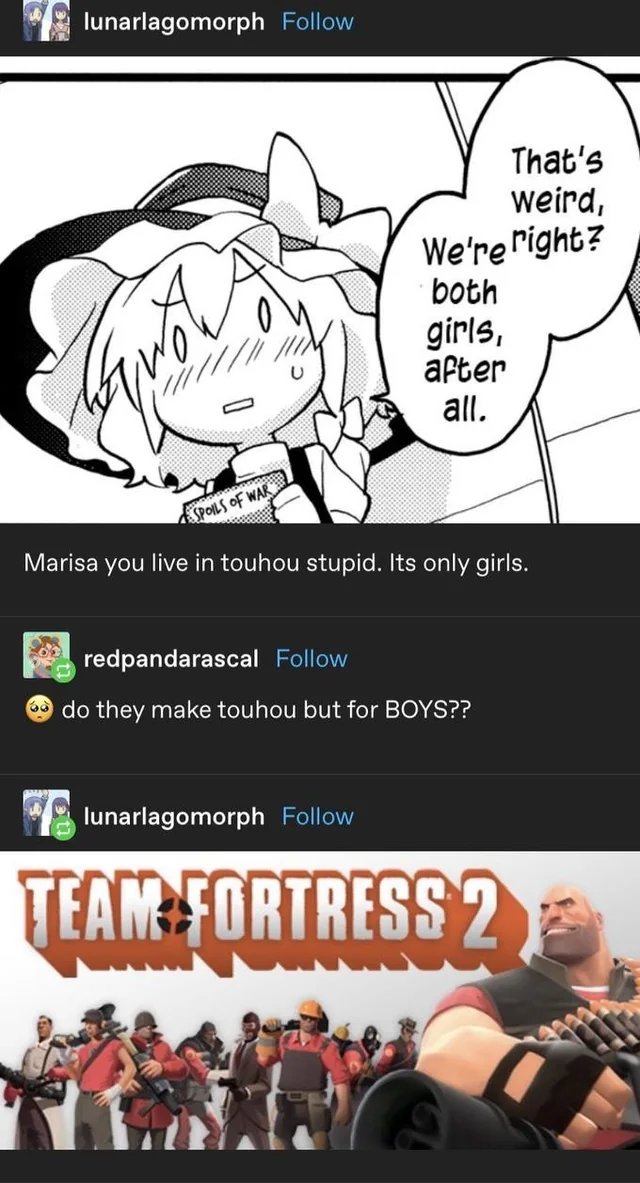 >>736633710That medic is a spy!That demoman's a spy!That scout is a spy!