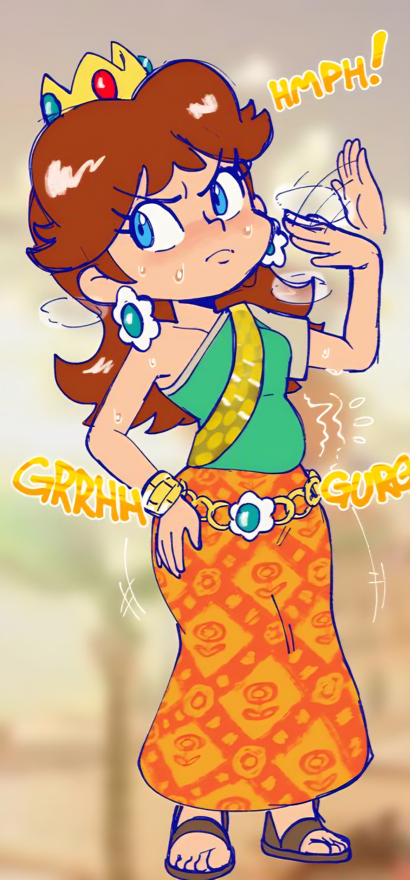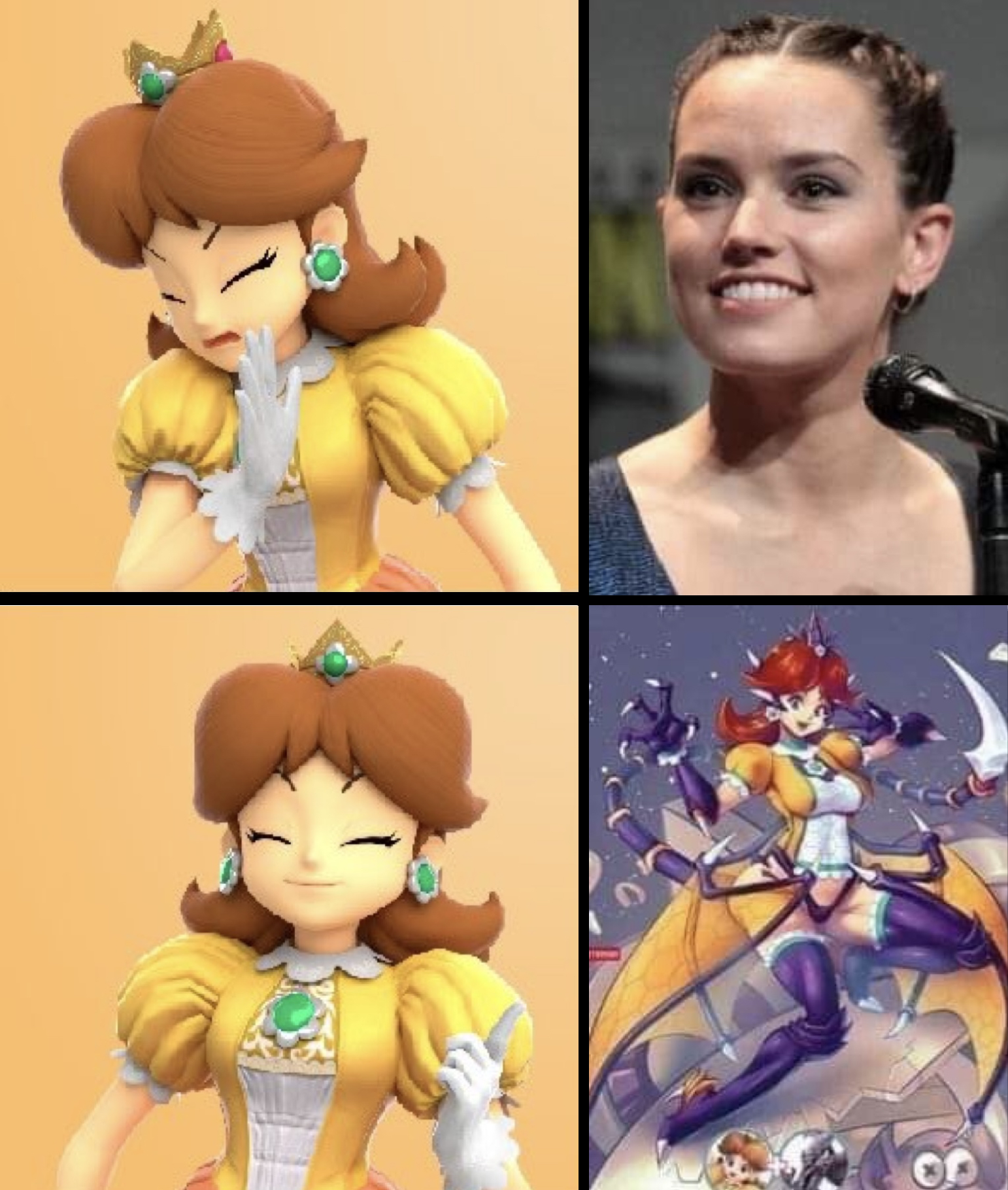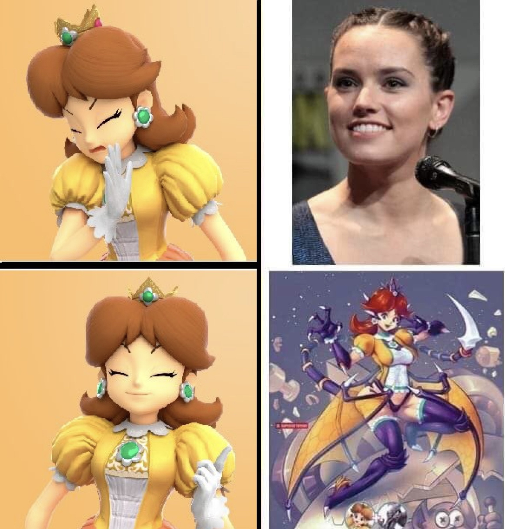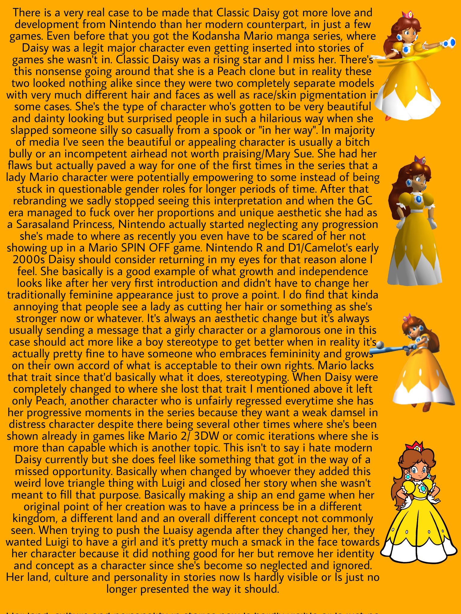 Daisy should be tan and much tougher than Peach, she should be the brawler of the Princesses.