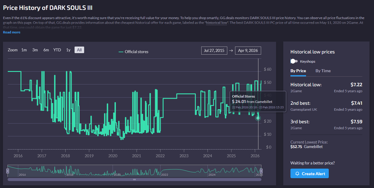 >>736636376DS2 and 3 are still in my wishlist because they refuse to give these decade old games a discount higher than 50%, while SteamDB teases me because the games used to go for way cheaper before.