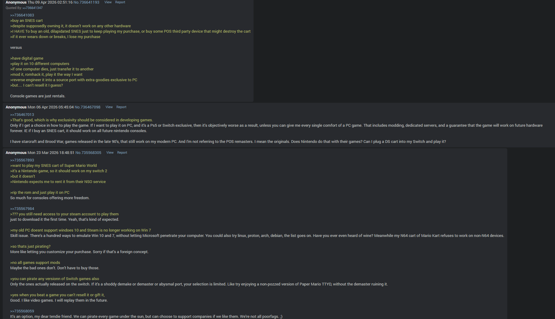 >>736636547no one is crying, it's fun to see nintendo tightening the noose on the only thing that consoles ever had over pc