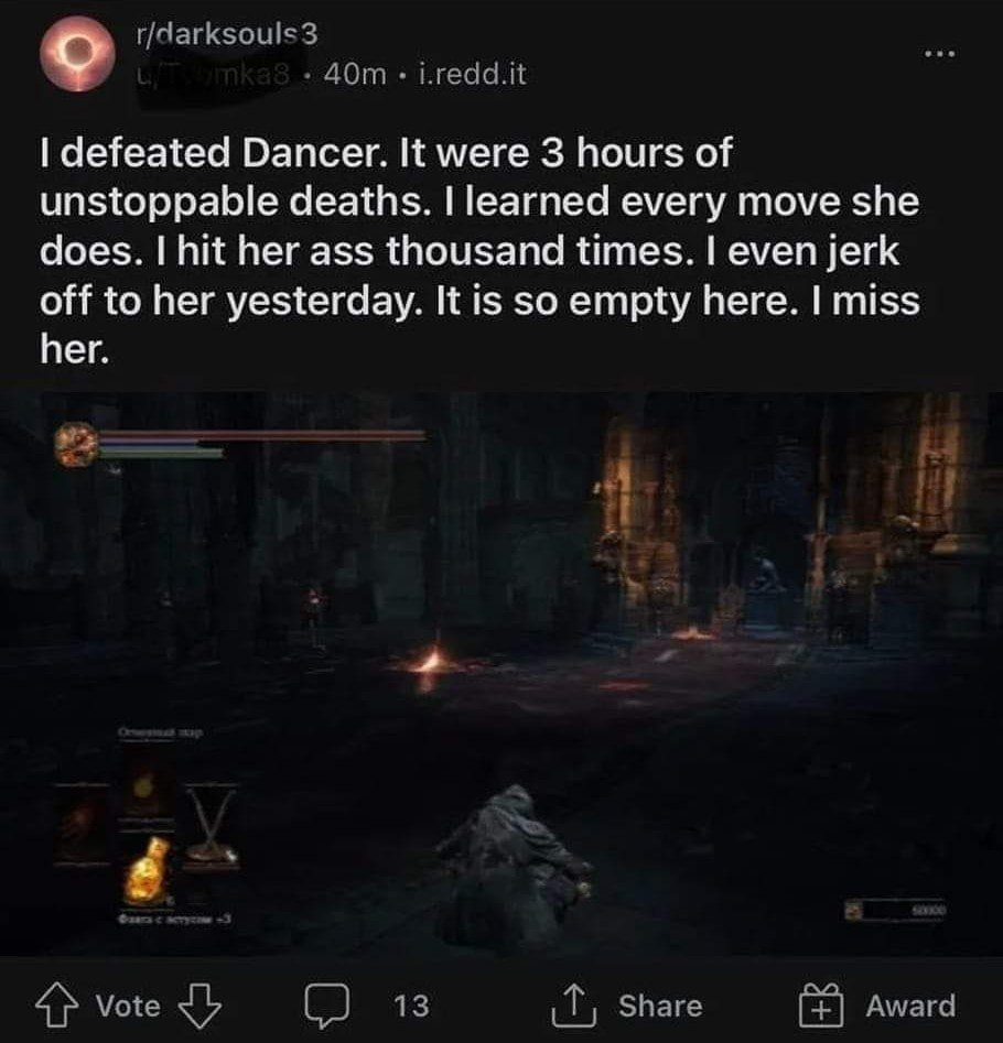 I remember it being my first souls game on day 1 and I bumrushed for the BKGA (looked up that it was found in smouldering lake), saw that its ds1 2h moveset was restored, and stopped progressing the story so that I could keep 2shotting mages in postpontiff irthyll. That was pretty fun. Shit game overall, 1 is still the best. At least it fixed my love BKGA.